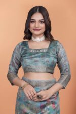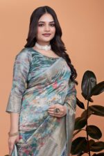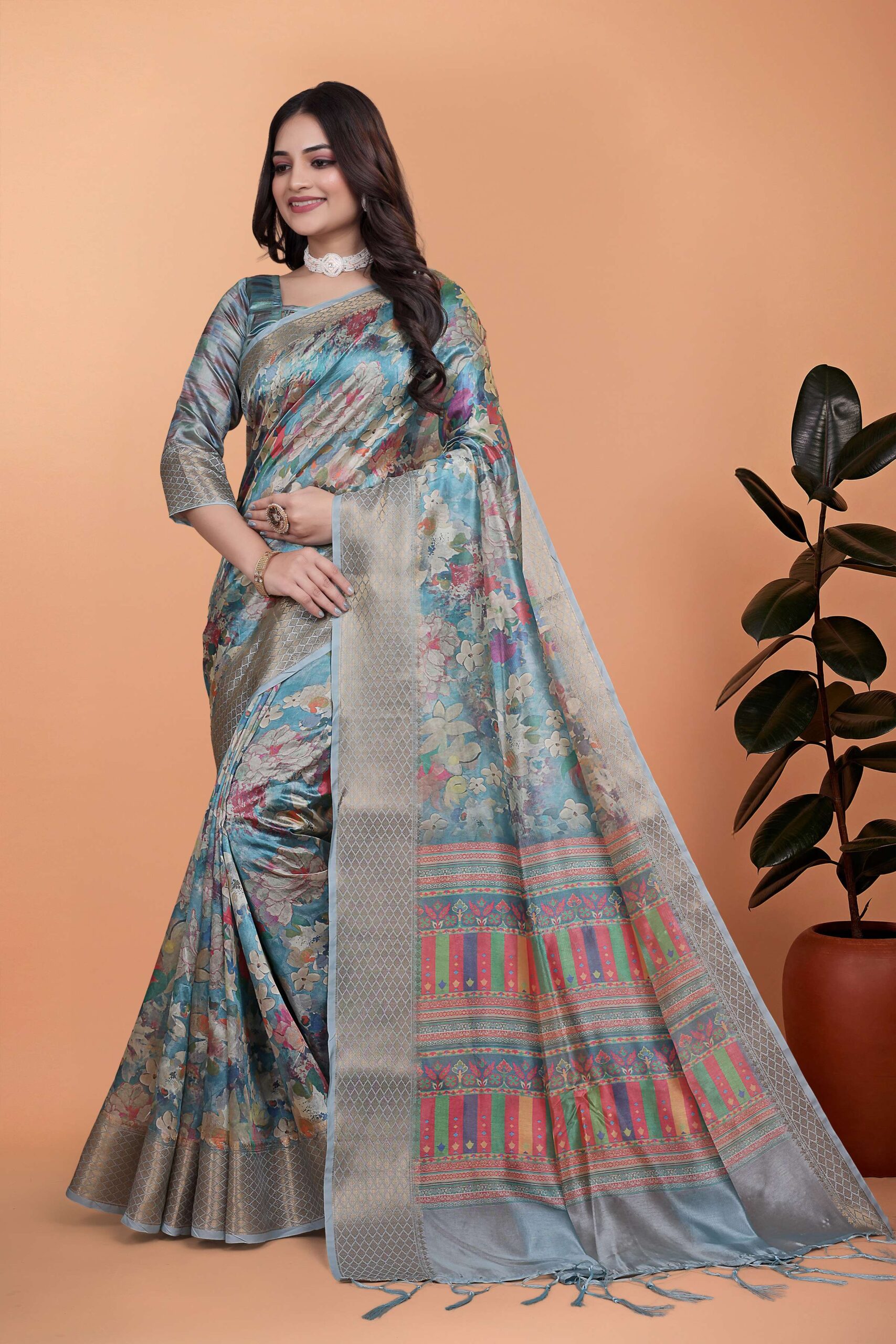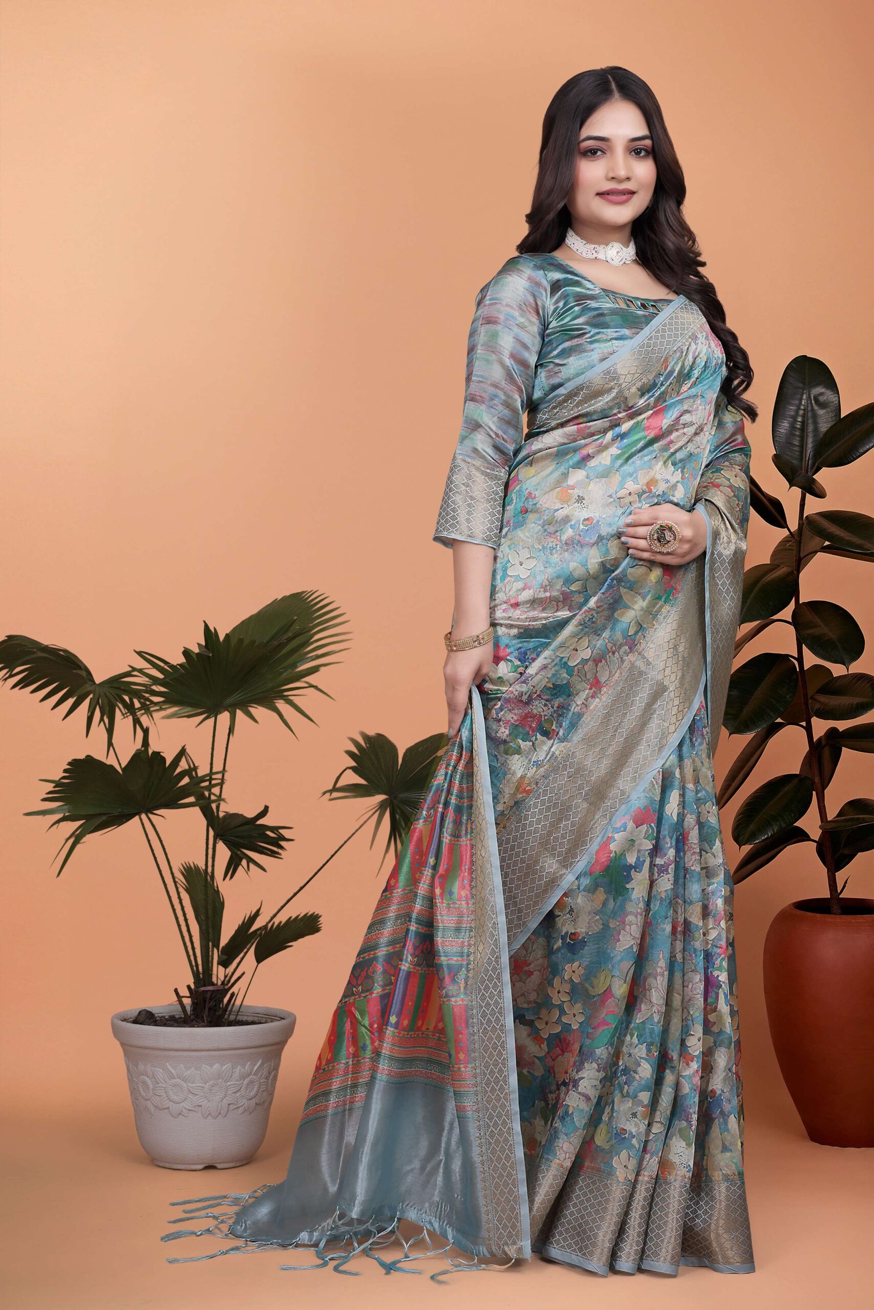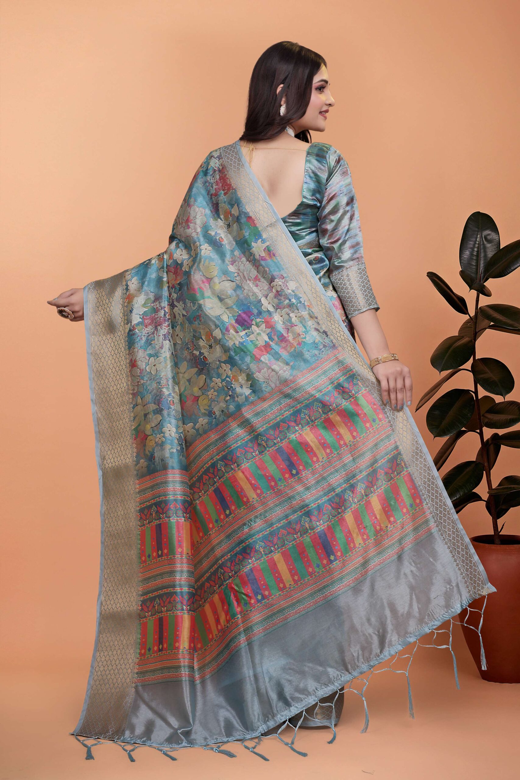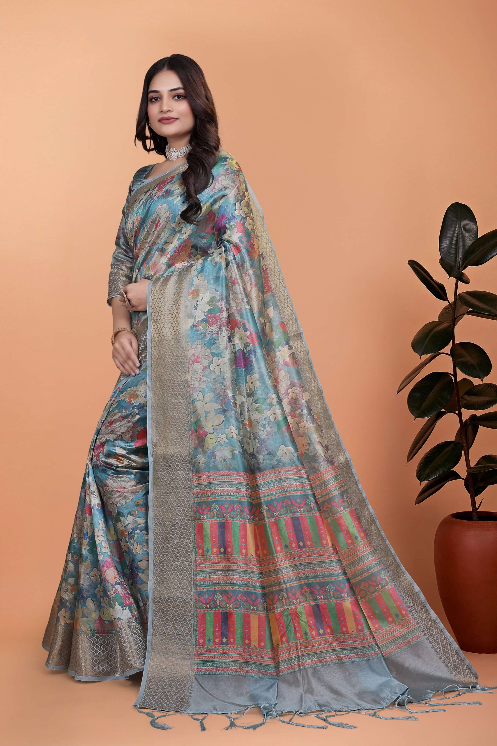 Drape yourself in elegance with this sky blue soft silk saree featuring a romantic all-over floral print in hues of ivory, pink, lilac, and mustard. The serene base is accentuated by a shimmering golden zari border, adding a touch of festive finesse.
