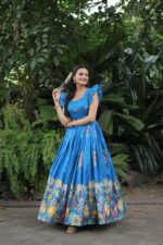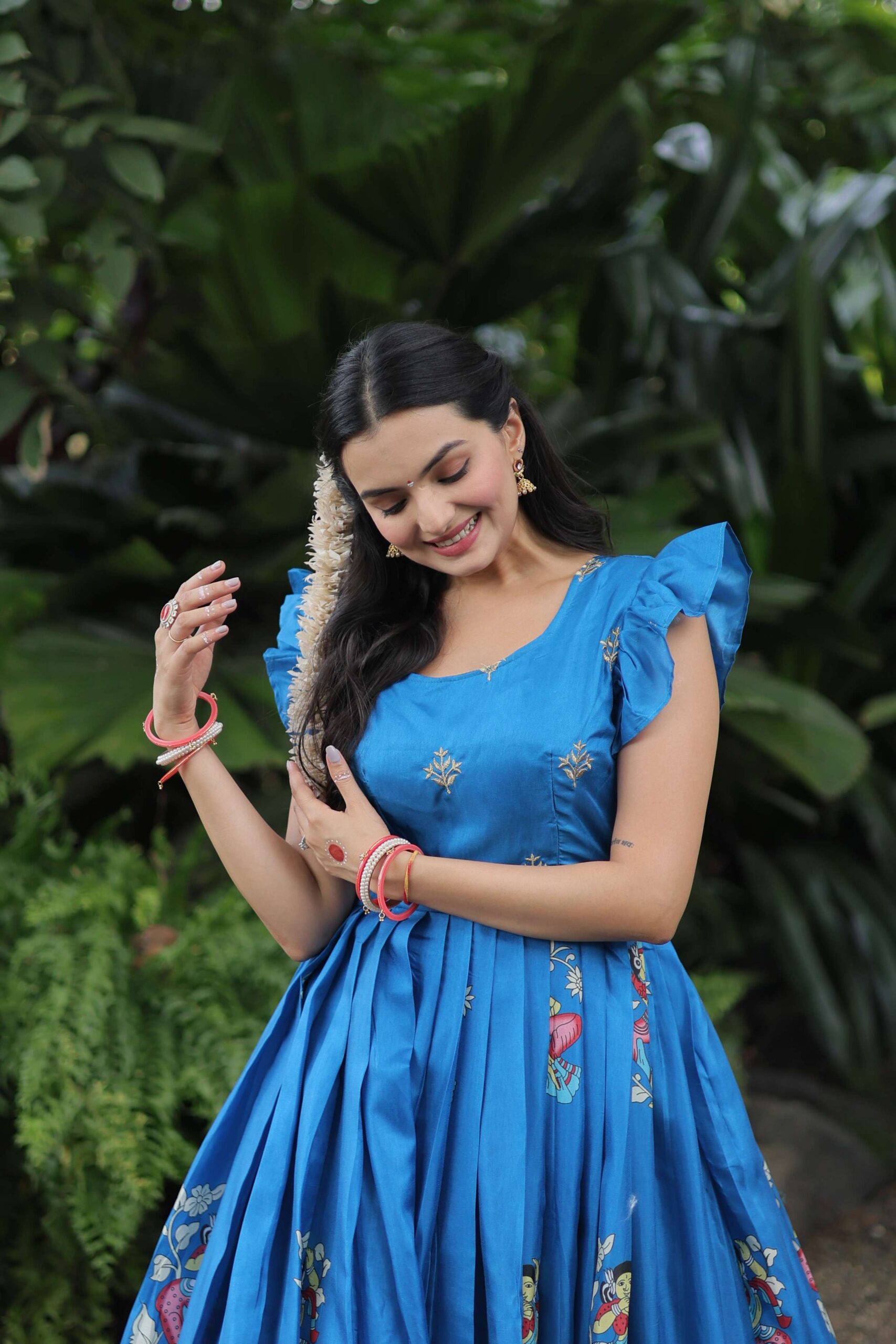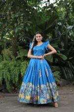 Featuring a fancy round neck, full sleeves, and a 12-meter flowing flair with frill stitching, the gown flatters all body types while ensuring comfort with soft cotton full-length lining. The coordinating Faux Blooming dupatta is beautifully embellished with sequins embroidered cutwork, completing the ensemble with elegance.
