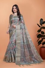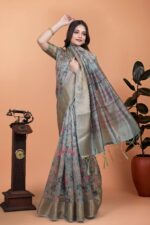 Drape yourself in this ethereal soft silk saree featuring an elegant combination of blue-green base adorned with intricate floral prints in pink, peach, and black. The smooth texture and graceful fall make it a perfect addition to your festive or traditional wardrobe.