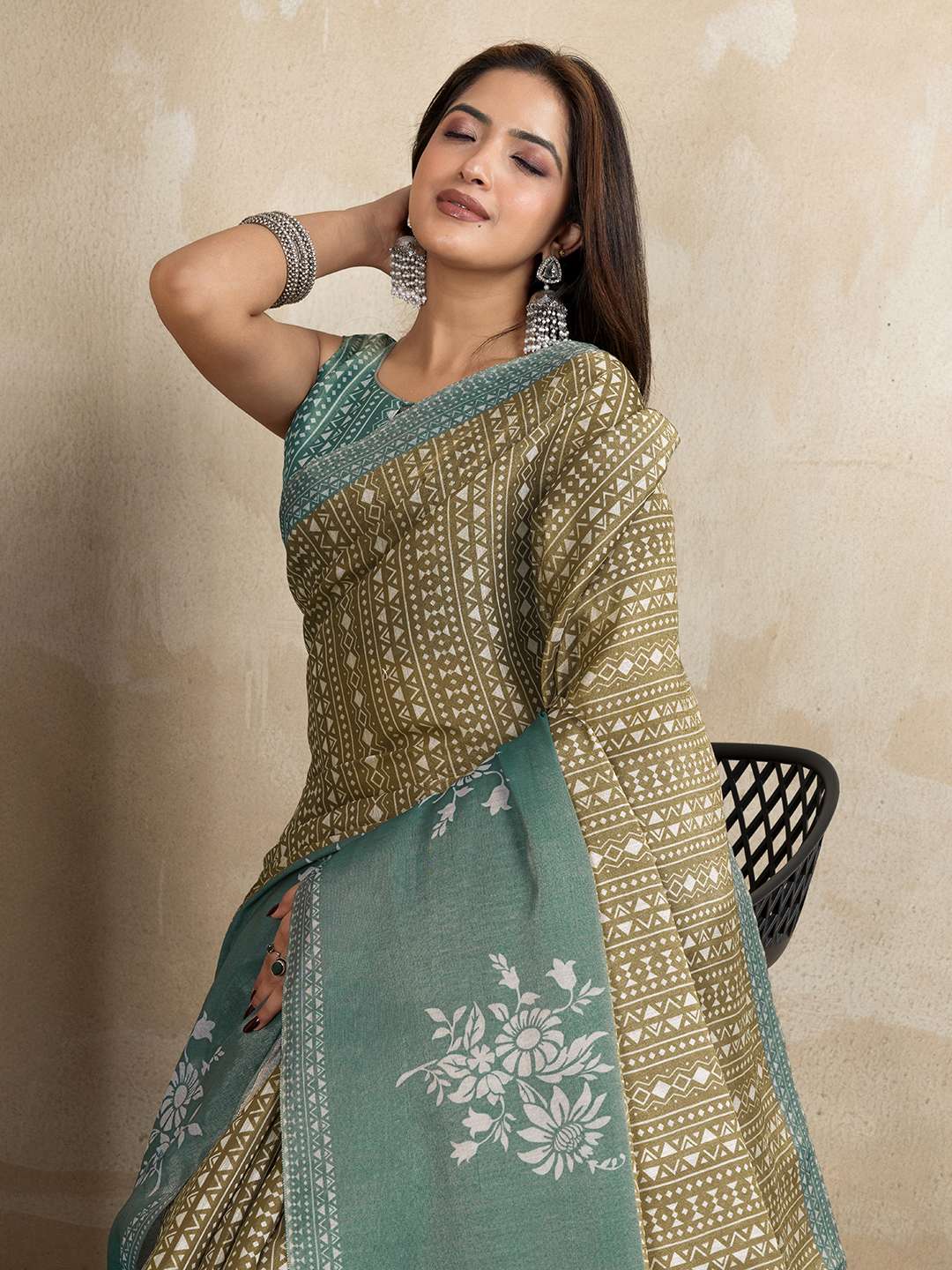 Make a striking style statement with this exquisite Olive Green and Teal Linen Saree, a perfect fusion of traditional motifs and contemporary design. Crafted from a high-quality, lightweight linen fabric, this saree provides a comfortable drape and a chic, earthy aesthetic.