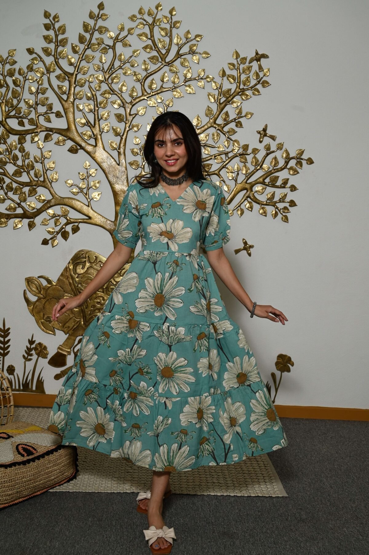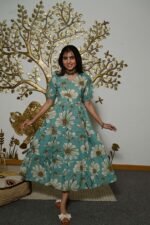 Elevate your everyday look with this Teal-Blue Floral Printed Cotton Anarkali Maxi Dress, designed to blend comfort with chic style. Crafted from breathable cotton fabric, this dress features a beautiful all-over floral pattern that adds a touch of charm and femininity. The V-neckline and puff sleeves give it a trendy silhouette, while the flared tiered hemline ensures graceful movement with every step.