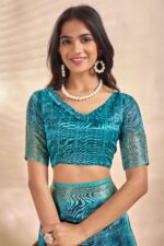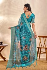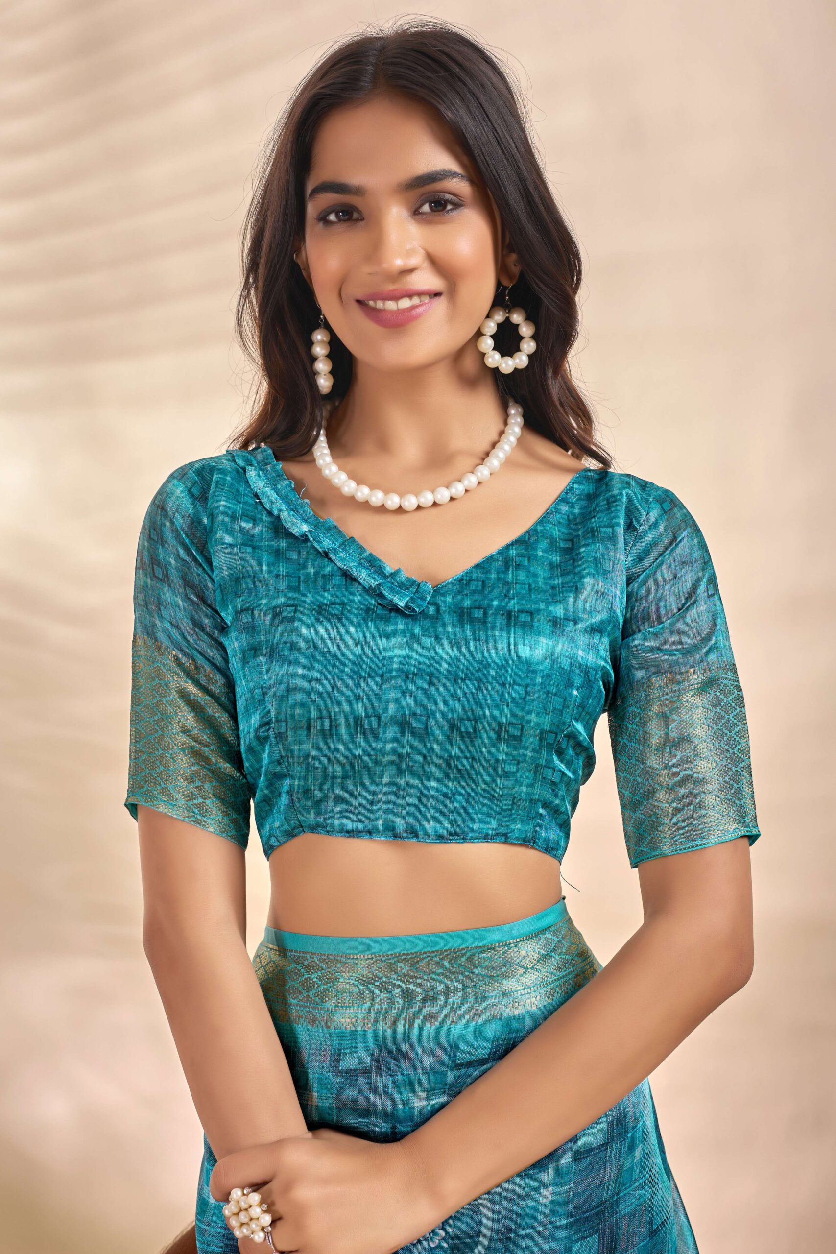 This elegant teal blue soft silk saree features a unique checkered weave adorned with beautifully placed floral digital prints. The pallu is enriched with striking rose motifs framed in intricate patterns, creating a graceful blend of tradition and modern aesthetics.