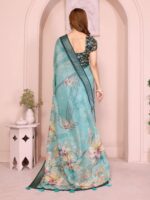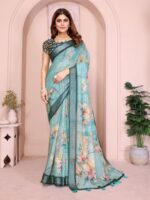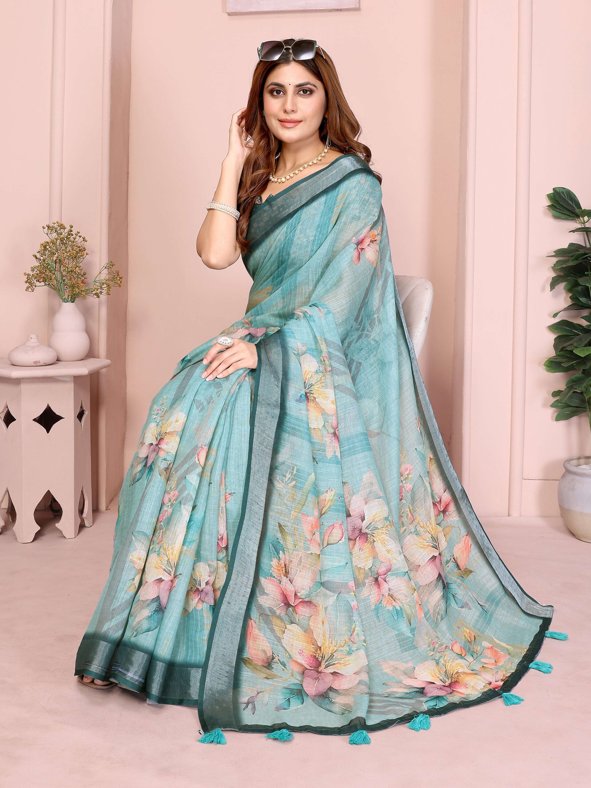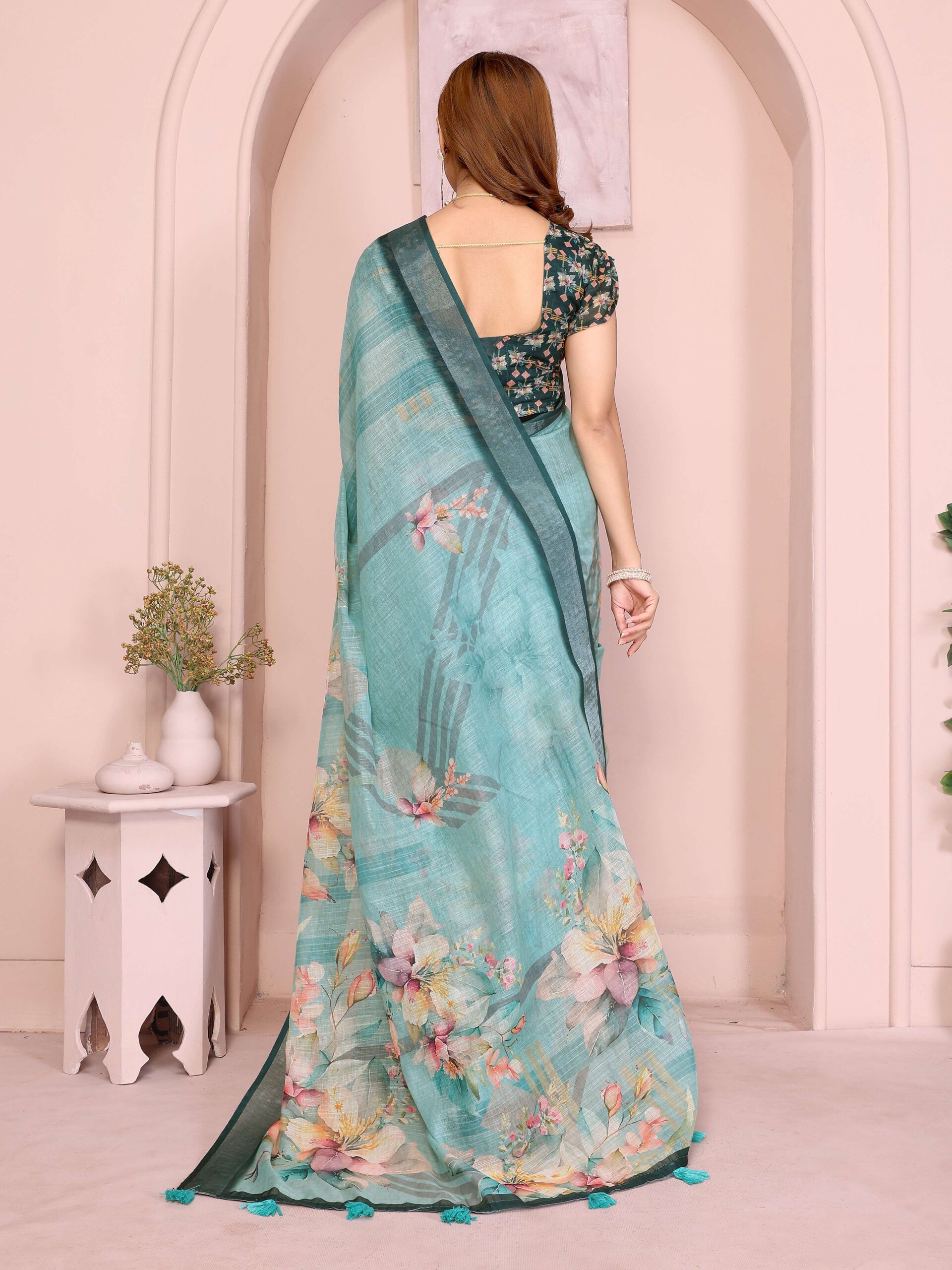 Elevate your everyday style with the Teal Green Linen Cotton Saree, designed for effortless charm and comfort. Crafted from breathable linen cotton, this saree drapes gracefully while keeping you comfortable throughout the day. Its rich teal base is adorned with delicate watercolor-style floral prints in soft shades of peach, cream, and yellow, offering a fresh and artistic appeal.