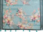 Teal Green Linen Cotton Saree with Watercolor Floral Prints & Deep Green Tassel Border