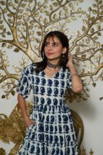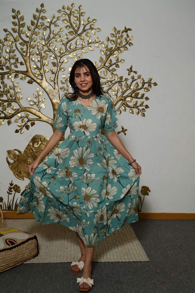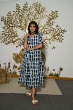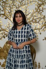 Elevate your everyday look with this White And Blue Floral Printed Cotton Anarkali Maxi Dress, designed to blend comfort with chic style. Crafted from breathable cotton fabric, this dress features a beautiful all-over floral pattern that adds a touch of charm and femininity. The V-neckline and puff sleeves give it a trendy silhouette, while the flared tiered hemline ensures graceful movement with every step.