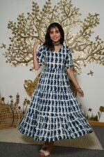 White And Blue Printed Cotton Anarkali Maxi Dress with Puff Sleeves Elegant Casual Wear