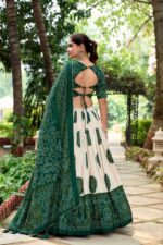 Step into timeless elegance with this White Dola Silk Lehenga Choli, beautifully complemented by a Forest Green Tussar Silk blouse. Crafted from premium Dola Silk, the lehenga showcases intricate Bandhej Print work, stitched with canvas and Can-Can for a voluminous 3.8-meter flair.