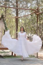 Make a statement at any occasion with this stunning fully-flaired designer gown crafted from premium Faux Georgette fabric. Designed with a flattering round neck, full sleeves, and a luxurious 15-meter flare with 5-layer frill stitching, it combines elegance with a regal silhouette. The soft cotton full-length lining ensures comfort while maintaining a refined look.