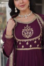Elevate your festive wardrobe with this exquisite gown set crafted from premium Faux Blooming Georgette. The gown features intricate sequins embroidery, full sleeves, a flattering round neckline, and a 3.5-meter flair, creating a graceful and flowing silhouette. The full-length cotton lining ensures comfort from top to bottom.