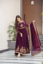 The faux blooming georgette gown features delicate zari thread and sequins embroidery, a fancy round neckline, full sleeves, and a graceful 3.5-meter flair. A soft full cotton lining from top to bottom ensures comfort without compromising on style.