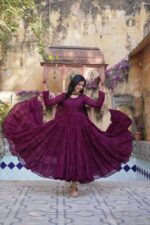 Make a statement at any occasion with this premium ready-made gown set. Crafted from luxurious Star Georgette, the gown features a full 15-meter flare, 5-layer frill stitching, full sleeves, and a flattering round neckline, ensuring a graceful and elegant silhouette. The full-length cotton lining adds comfort from top to bottom, making it perfect for all-day wear.