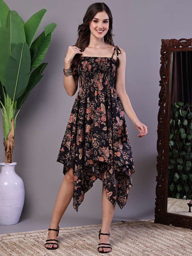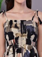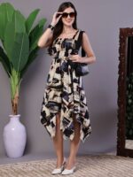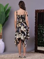 Level up your style with this trend-setting dress. Its vibrant abstract print and distinctive high-low handkerchief hemline create an eye-catching look. The tie-up shoulder straps ensure a comfortable and adjustable fit. Whether for daytime casual events or evening gatherings, this dress is the perfect choice for effortless flair.