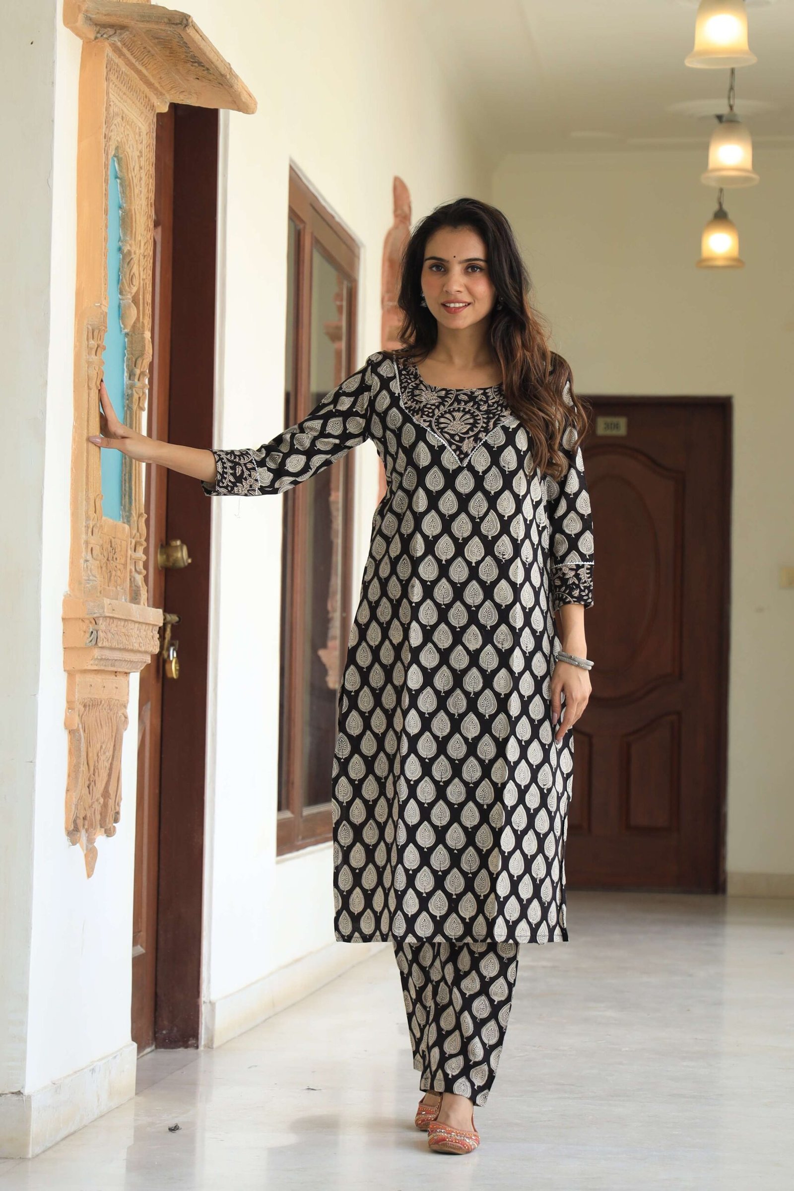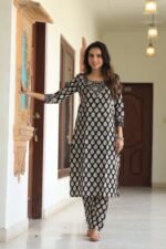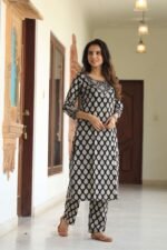 black printed cotton kurta set, crafted for women who love a balance of tradition and modern style. The kurta features all-over white handblock-inspired circular motifs, paired with a contrast striped yoke design that adds a chic touch to the outfit. Designed with a straight fit and 3/4th sleeves, this set offers effortless comfort and sophistication. The breathable cotton fabric makes it perfect for daily wear, office dressing, festive events, and semi-formal gatherings. It comes with matching printed pants, ensuring a complete coordinated look.