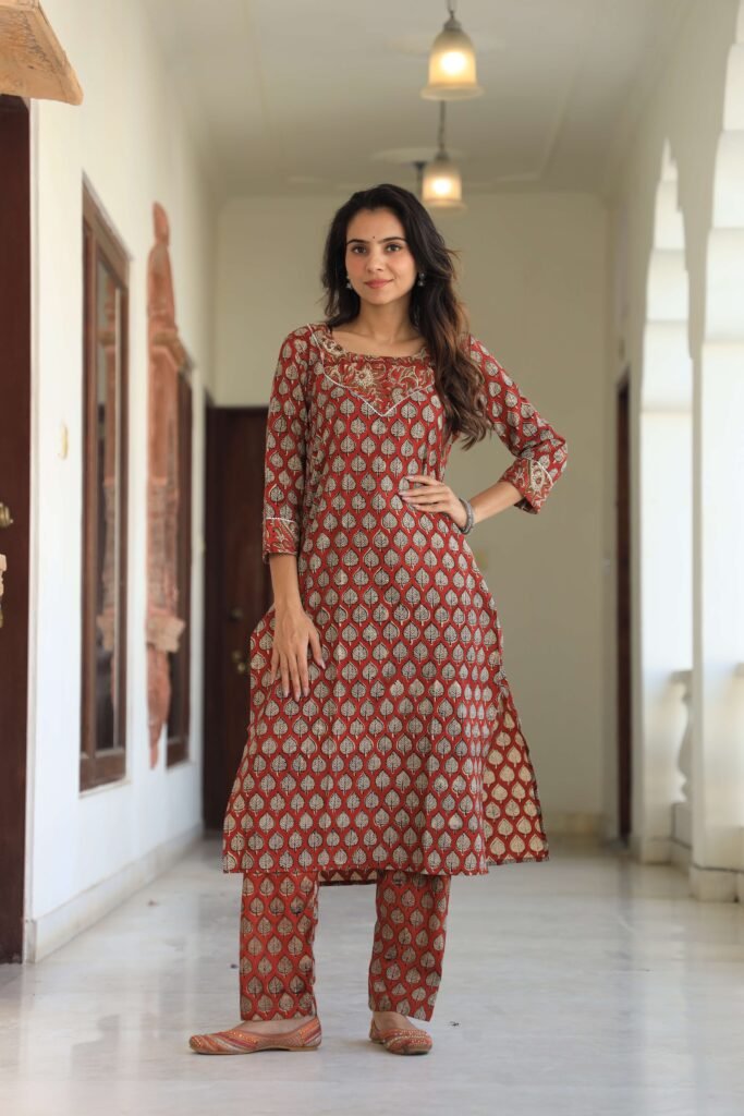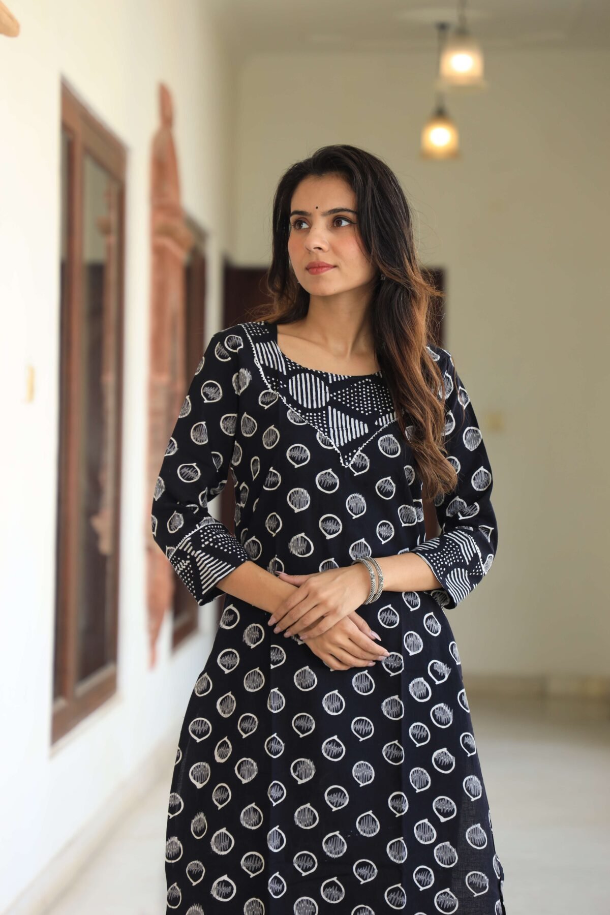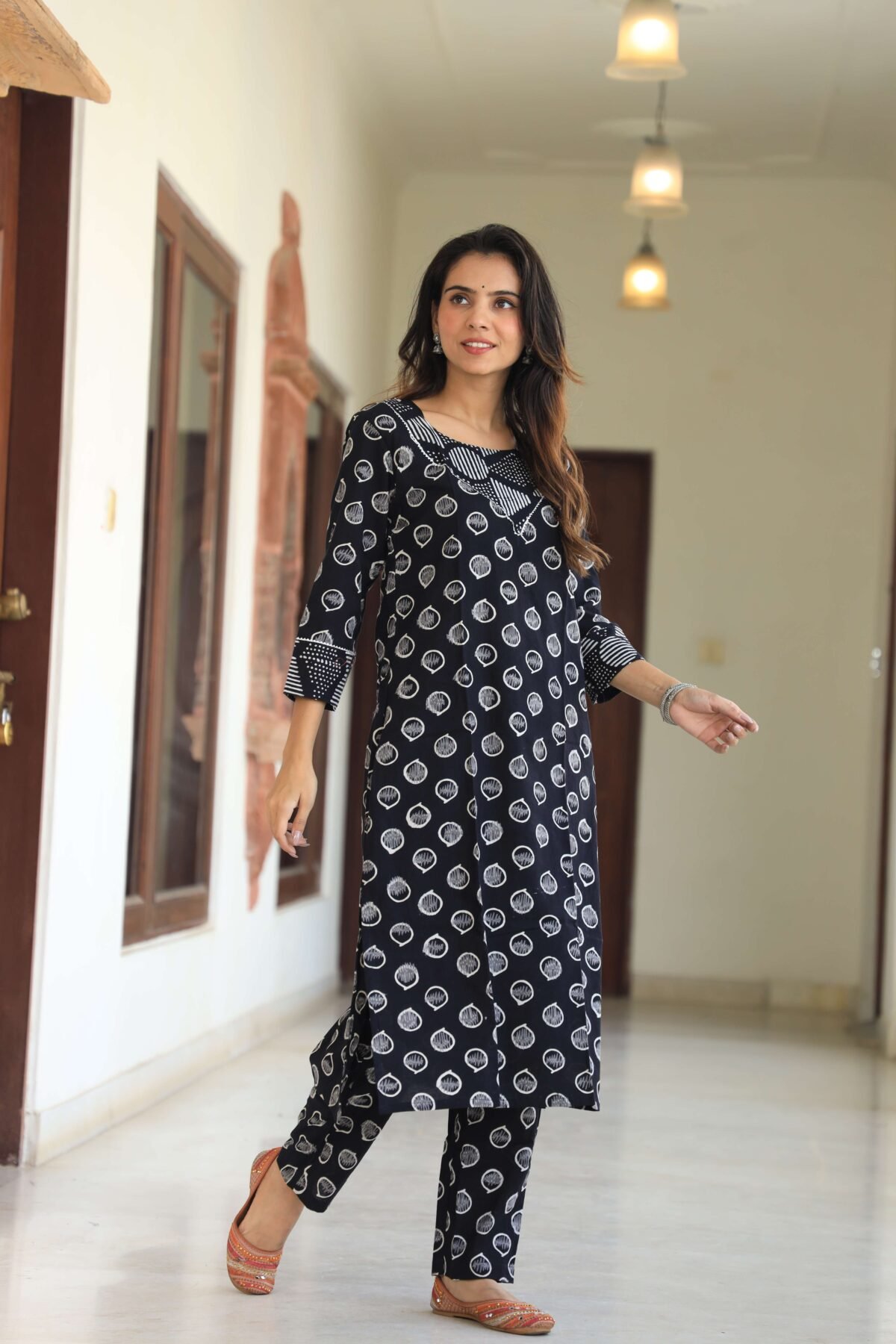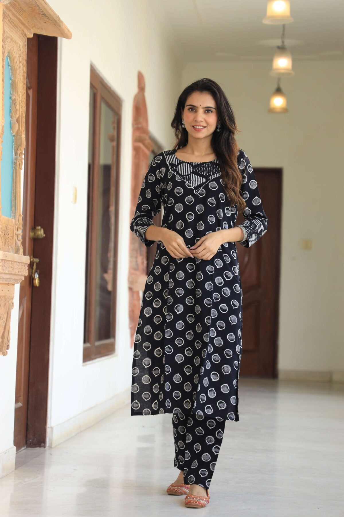 black printed cotton kurta set, crafted for women who love a balance of tradition and modern style. The kurta features all-over white handblock-inspired circular motifs, paired with a contrast striped yoke design that adds a chic touch to the outfit. Designed with a straight fit and 3/4th sleeves, this set offers effortless comfort and sophistication. The breathable cotton fabric makes it perfect for daily wear, office dressing, festive events, and semi-formal gatherings. It comes with matching printed pants, ensuring a complete coordinated look.