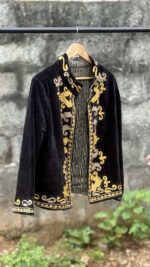 Womens Black Velvet Embroidered Jacket with Floral Design