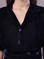Women’s Black Velvet Solid Printed Shirt Midi Dress with Belt