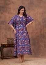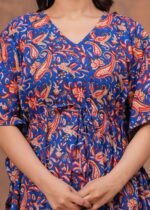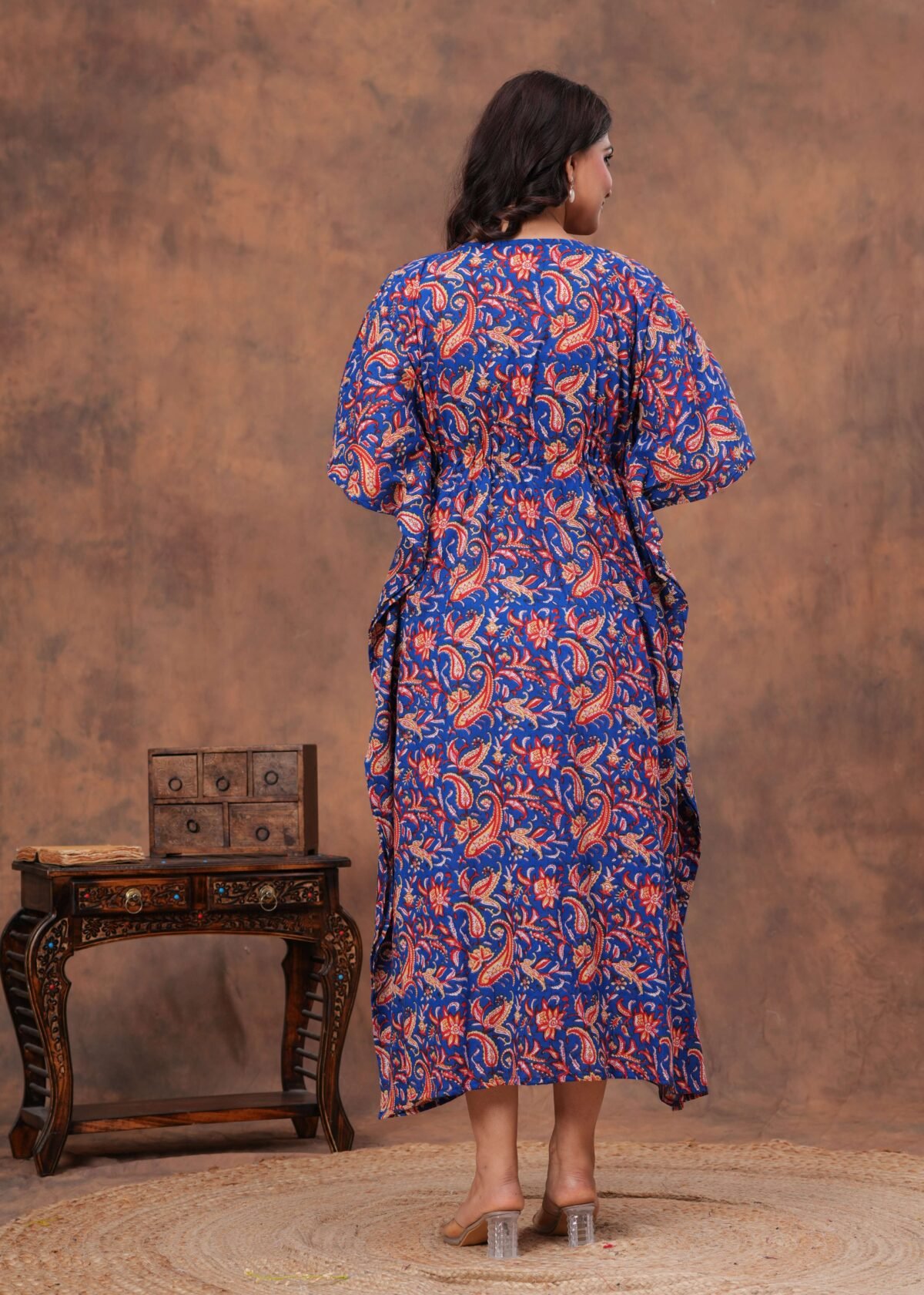 Women’s Blue Cotton Printed Kaftan Dress with Drawstring Waist