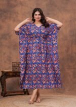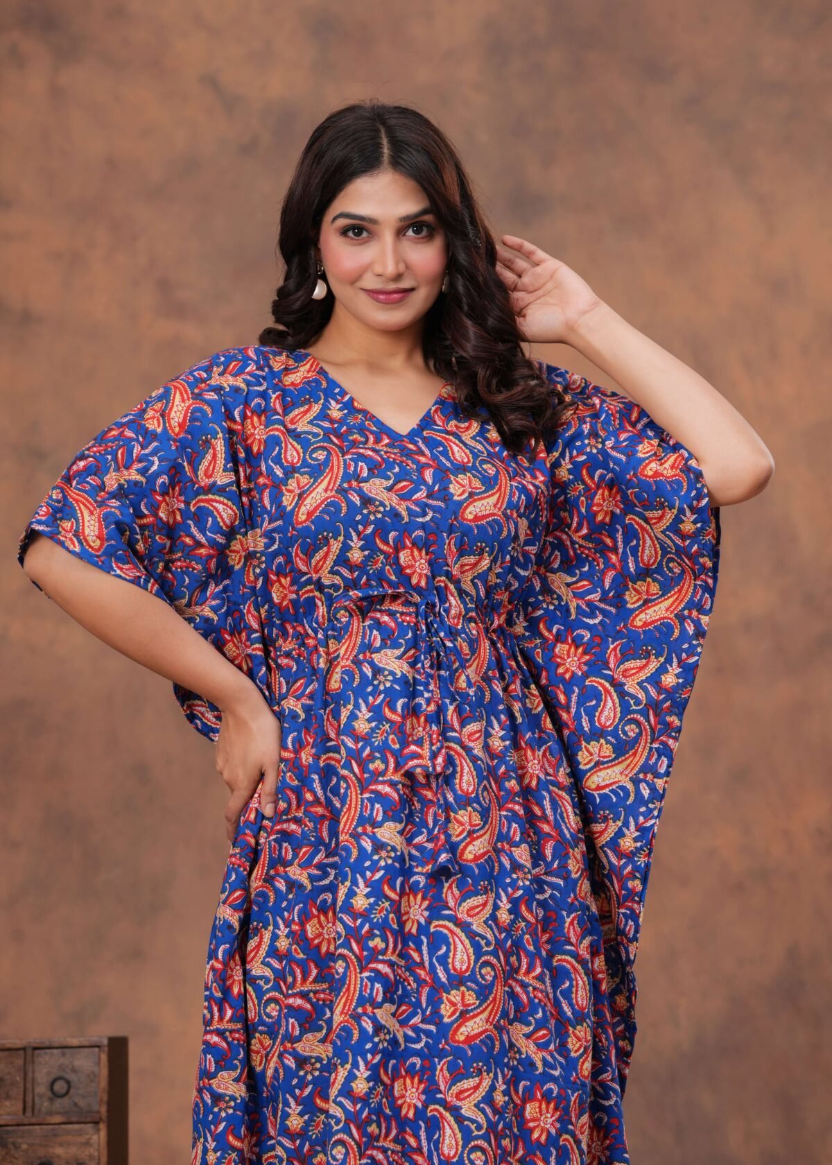 Elevate your everyday style with this beautifully crafted cotton kaftan dress. Designed for comfort and elegance, it features a soft breathable fabric that feels gentle on the skin, making it perfect for all-day wear. The relaxed fit is enhanced with a drawstring waist, allowing you to adjust the silhouette for a flattering look. With its stylish print and flowing design, this kaftan is ideal for lounging at home, casual outings, or vacation wear.