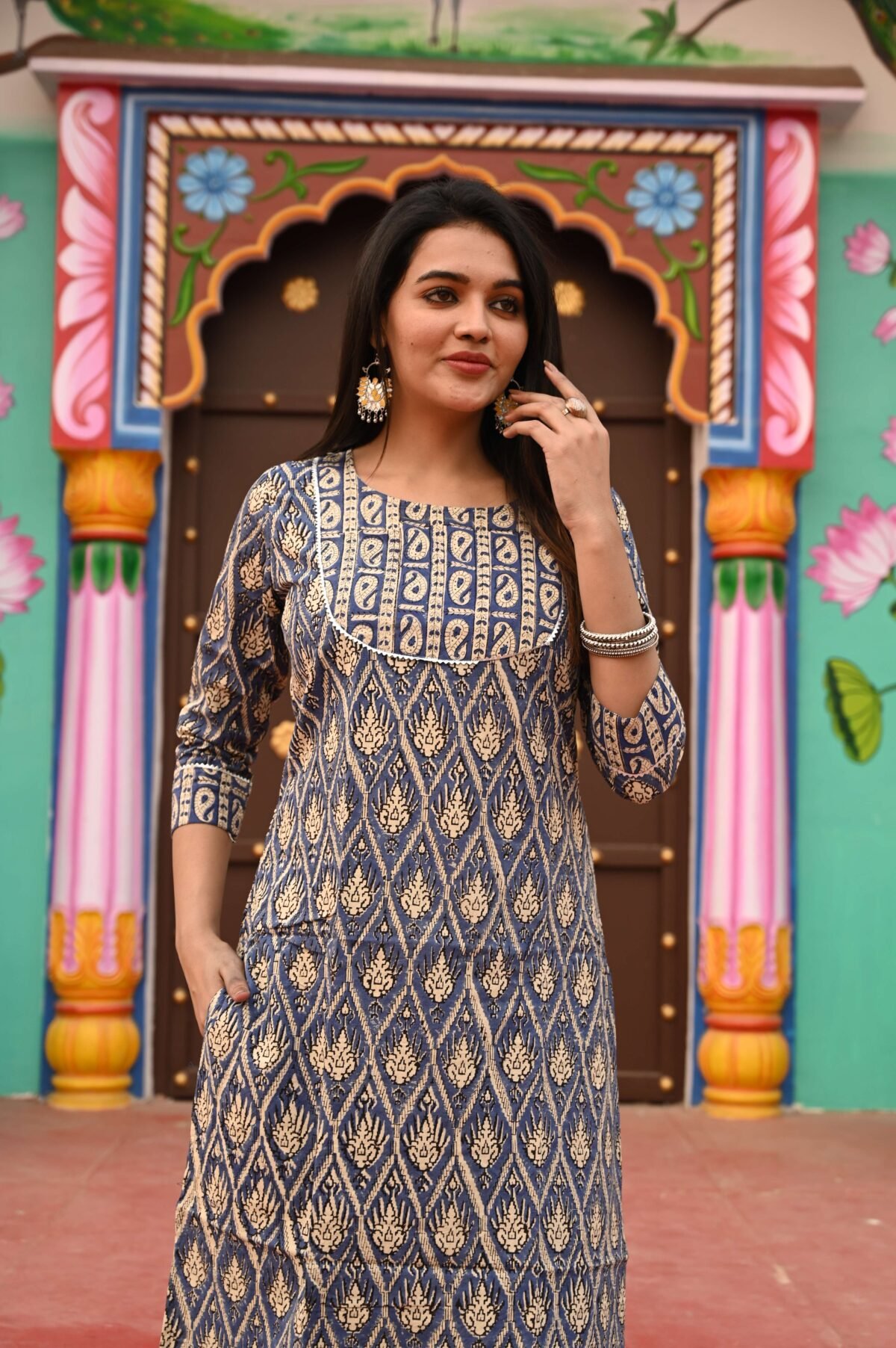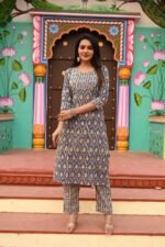 Enhance your ethnic collection with this blue cotton printed kurta and pant set, designed to keep you comfortable and stylish all day long. The kurta features a mix of geometric and floral prints in vertical patterns, complemented by a unique contrast yoke and sleeve borders. Its straight-cut silhouette ensures a sleek fit, while the matching pants complete the look for a perfectly coordinated outfit.Made from breathable cotton, this kurta set is ideal for daily wear, office meetings, festive occasions, or casual outings. Its elegant design strikes the perfect balance between traditional and contemporary style.