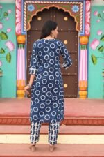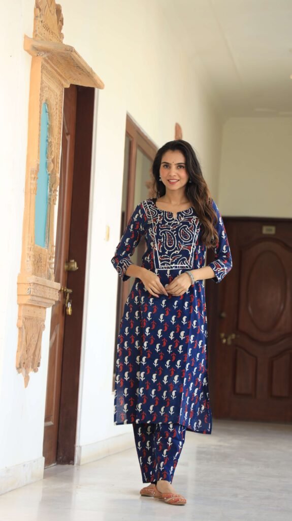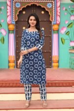 Enhance your ethnic collection with this blue cotton printed kurta and pant set, designed to keep you comfortable and stylish all day long. The kurta features a mix of geometric and floral prints in vertical patterns, complemented by a unique contrast yoke and sleeve borders. Its straight-cut silhouette ensures a sleek fit, while the matching pants complete the look for a perfectly coordinated outfit.Made from breathable cotton, this kurta set is ideal for daily wear, office meetings, festive occasions, or casual outings. Its elegant design strikes the perfect balance between traditional and contemporary style.