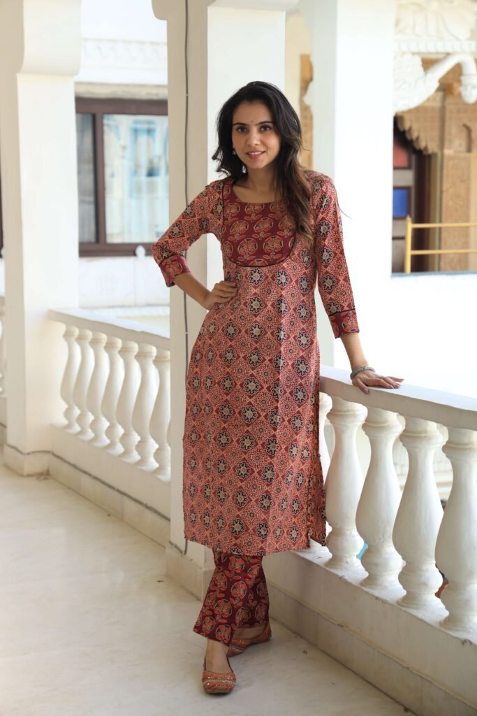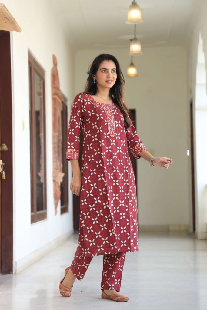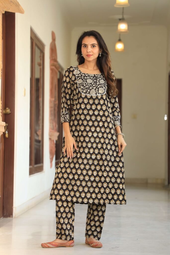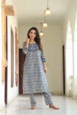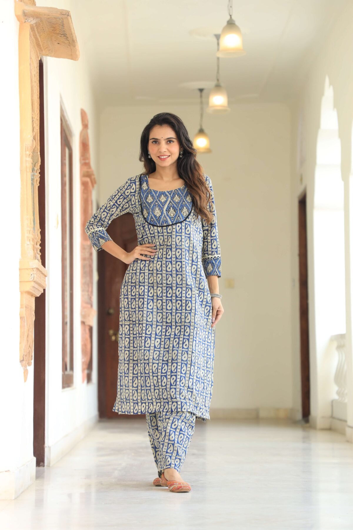 Enhance your ethnic collection with this blue cotton printed kurta and pant set, designed to keep you comfortable and stylish all day long. The kurta features a mix of geometric and floral prints in vertical patterns, complemented by a unique contrast yoke and sleeve borders. Its straight-cut silhouette ensures a sleek fit, while the matching pants complete the look for a perfectly coordinated outfit.Made from breathable cotton, this kurta set is ideal for daily wear, office meetings, festive occasions, or casual outings. Its elegant design strikes the perfect balance between traditional and contemporary style.