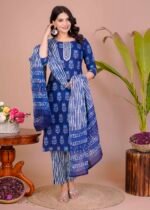 Women’s Blue Cotton Printed Straight Kurti with Pant & Dupatta Set