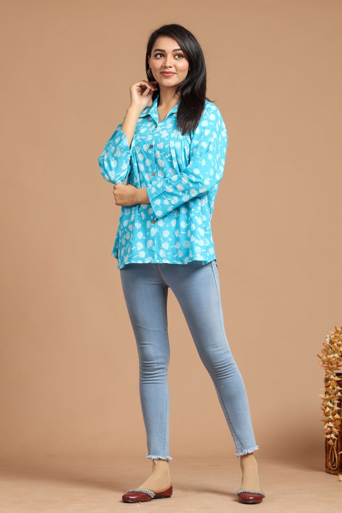 Blue floral printed cotton shirt-style top for women. Designed with a collared neckline, button-down front, and full sleeves, it offers a relaxed yet stylish look. The breathable cotton fabric makes it comfortable for daily wear, office meetings, or casual outings. Pair it with jeans, trousers, or skirts for a chic Indo-western vibe.