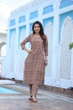 Elevate your ethnic style with this brown cotton printed kurta and pant set designed with intricate leaf motifs for a graceful touch. The kurta comes in a straight-cut silhouette with side slits, offering both style and ease of movement. Its matching printed pants complete the look, making it a coordinated and trendy outfit. Crafted from breathable cotton fabric, this kurta set ensures comfort all day long while keeping your look effortlessly chic. Ideal for workwear, casual outings, festive gatherings, and semi-formal occasions, this piece blends simplicity with sophistication.