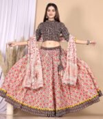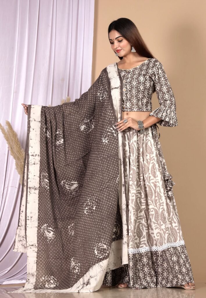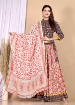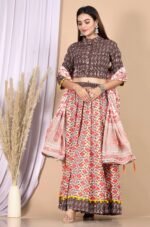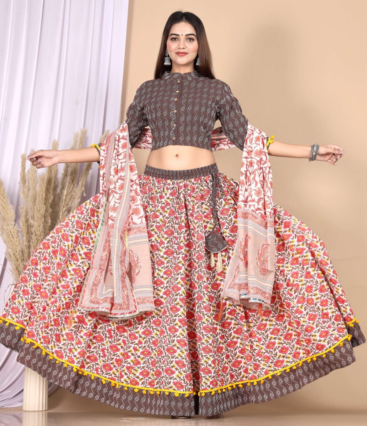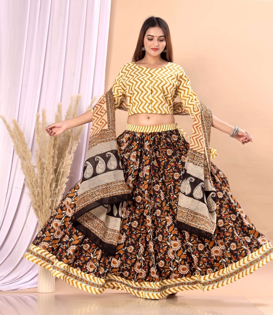 Women’s Brown Cotton Printed Lehenga Choli Dupatta Set