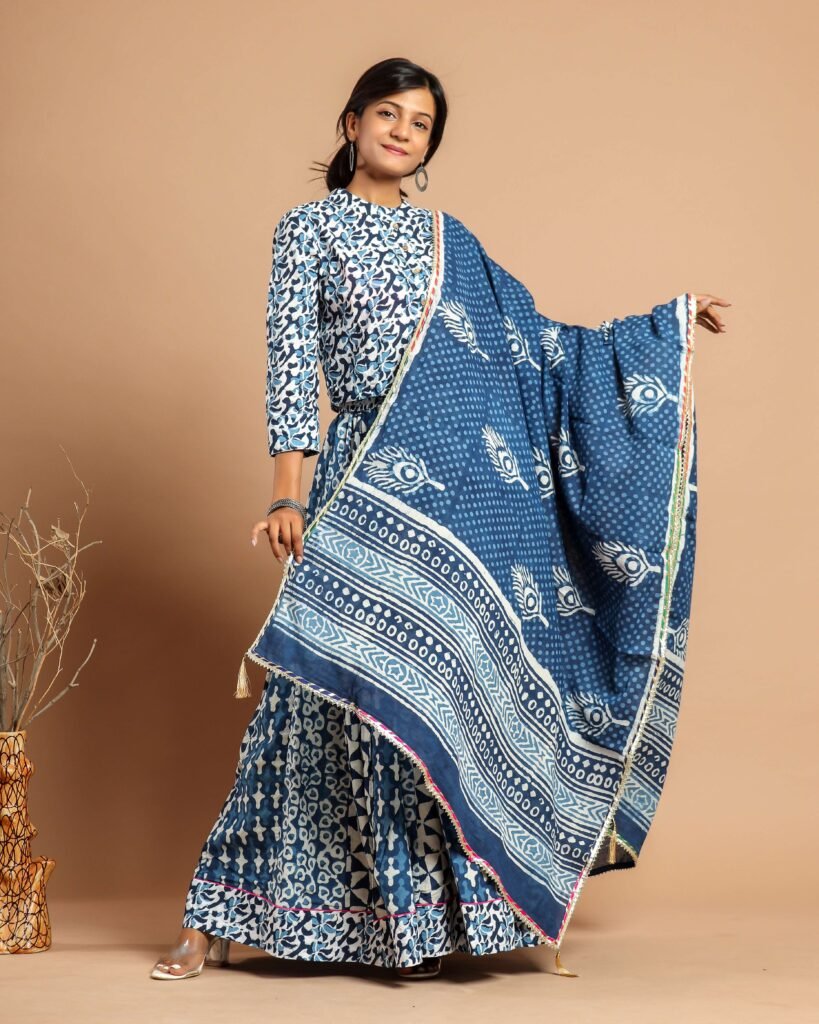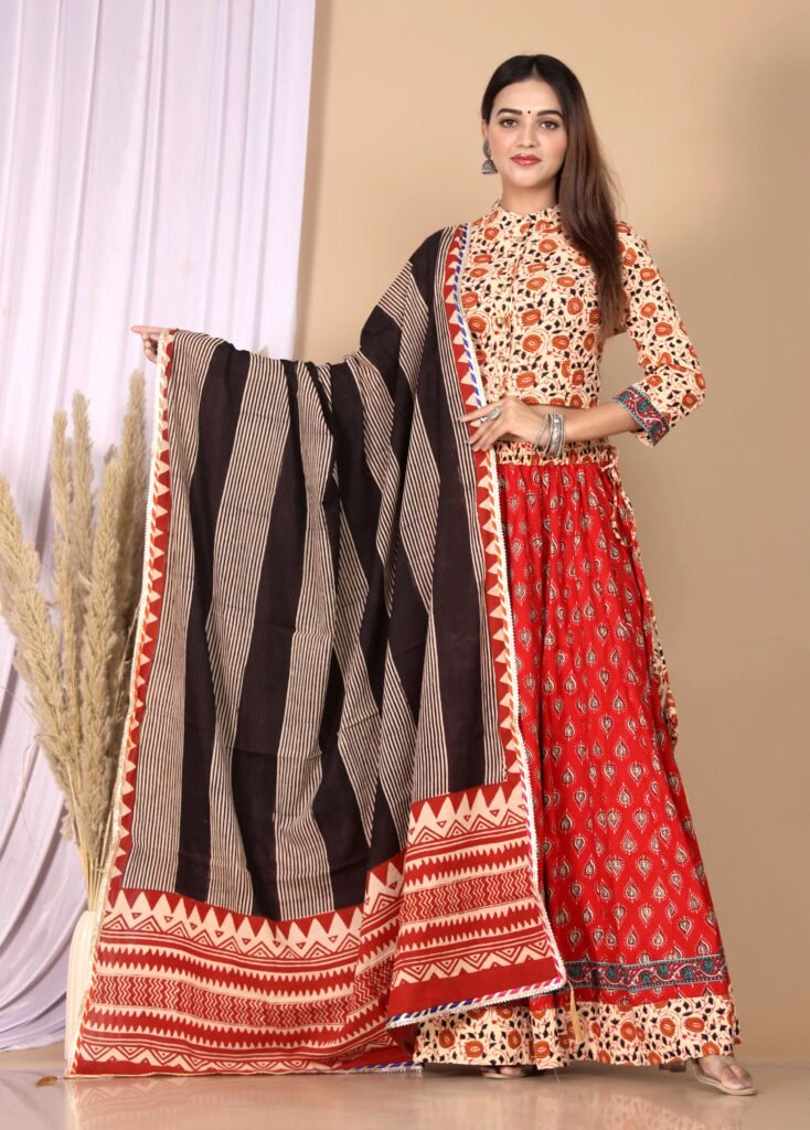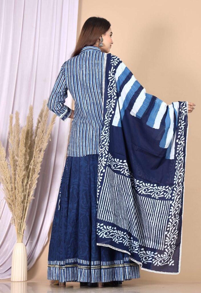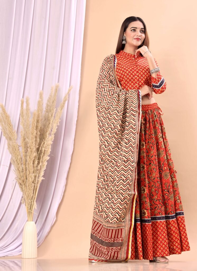 Elegance with this beautifully crafted cotton lehenga set, designed to bring together tradition and modern charm. The blouse features bold zigzag patterns that add a contemporary edge, perfectly paired with a flowy skirt adorned in intricate floral motifs. A matching dupatta with detailed borders completes the ensemble, making it ideal for festive occasions, weddings, or cultural celebrations.