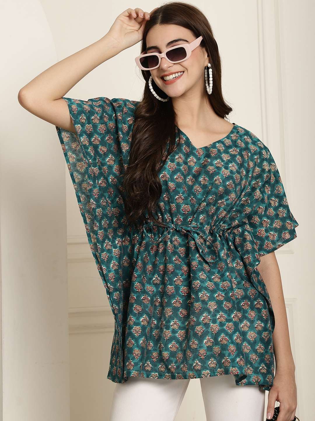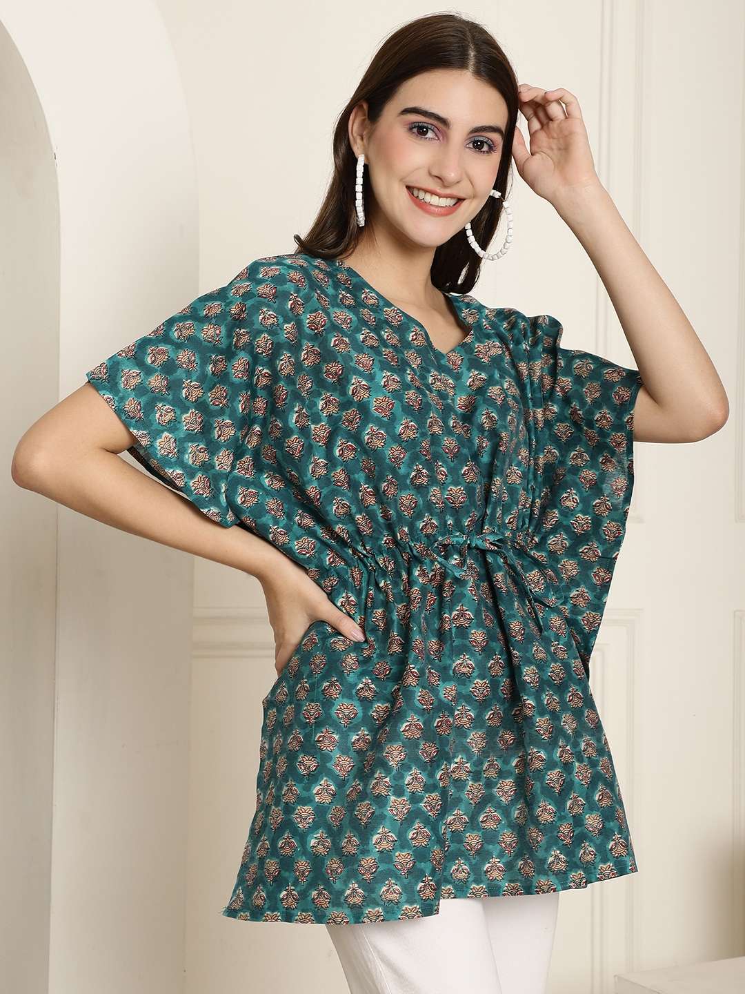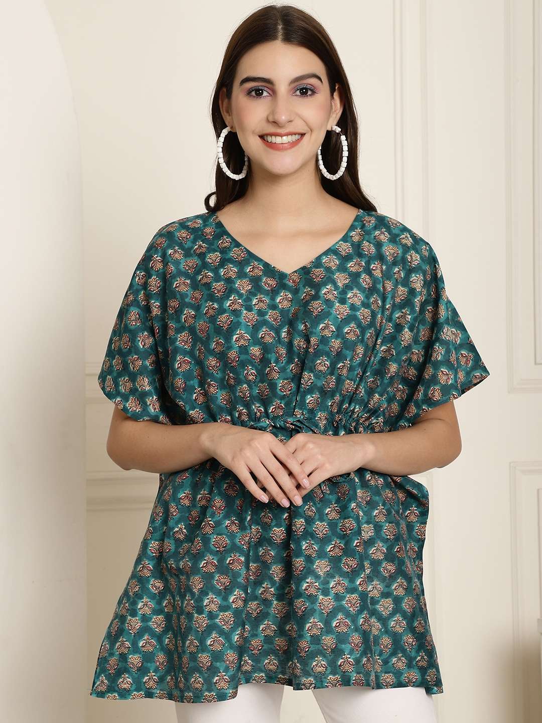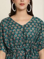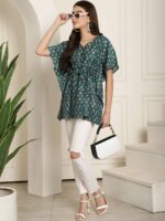 Women’s Chanderi Printed Kaftan Top With Bell Sleeve Dress (Green)