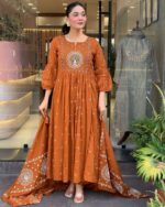 Women’s Cotton Embroidered Anarkali Kurti With Malmal Dupatta Set