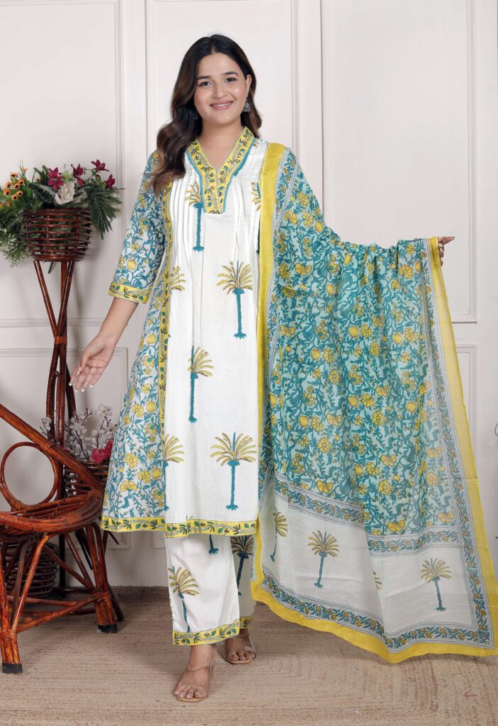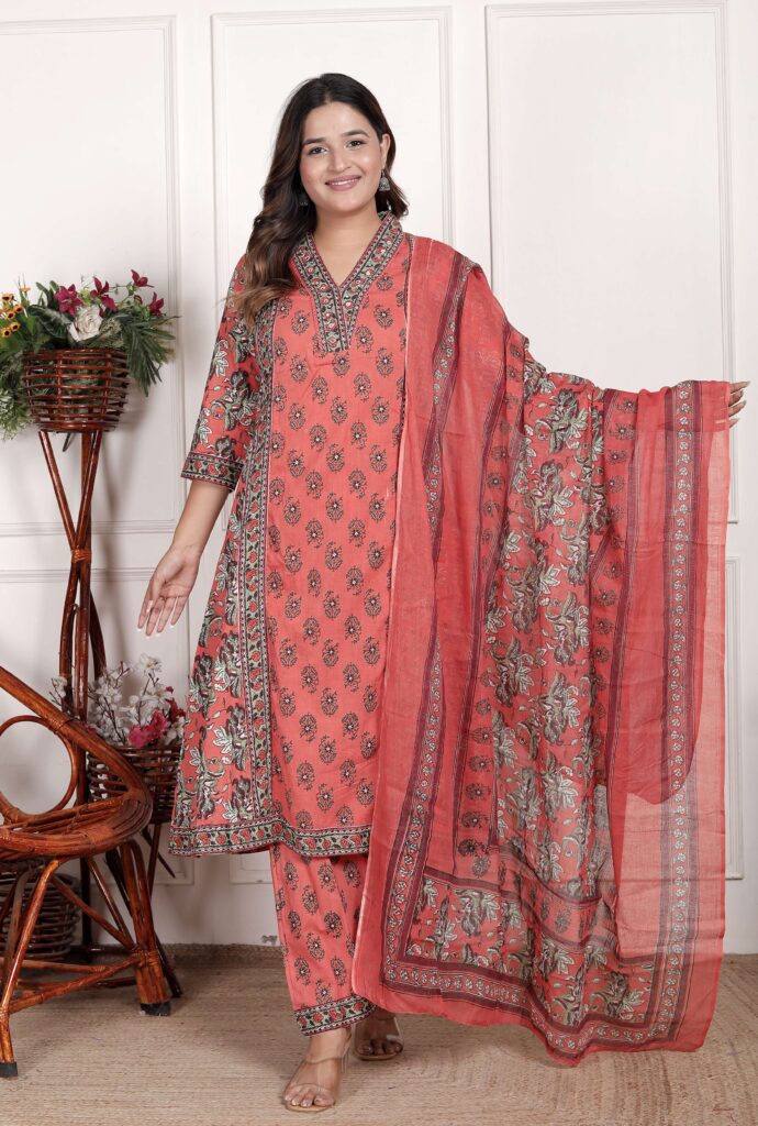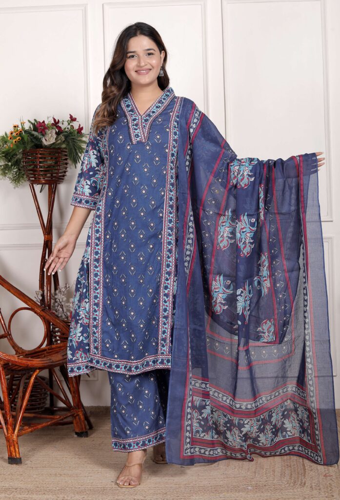 “Cotton 60×60 Kurti Set with Pant and Dupatta. Crafted from high-quality breathable cotton fabric, this outfit ensures comfort and style throughout the day. Designed with a modern yet traditional touch, it is perfect for festivals, office wear, parties, and daily use.This 3-piece kurti set includes a beautifully stitched kurti, matching pant, and a stylish dupatta that completes your ethnic look. The lightweight cotton material keeps you comfortable even in hot weather, while the intricate design adds a touch of sophistication.
