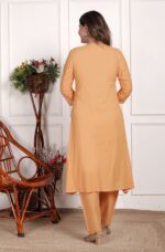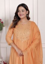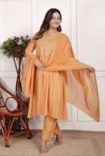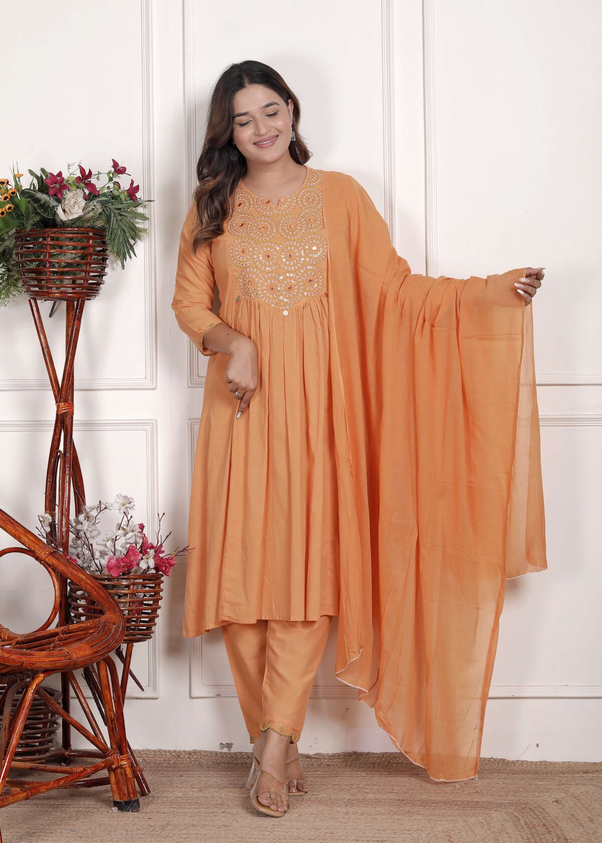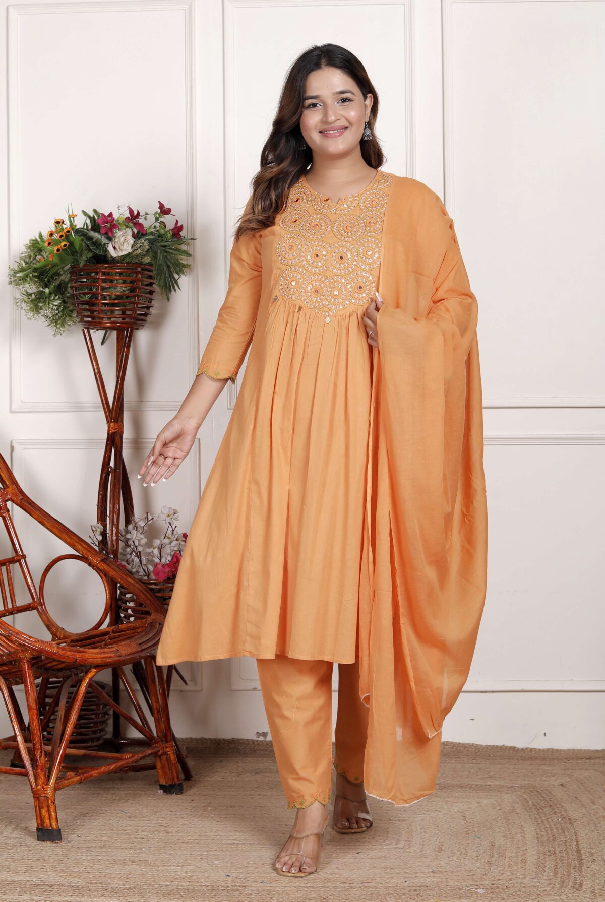 Women’s Cotton Embroidered Anarkali Kurti With Pant and Dupatta Set (ORANGE)