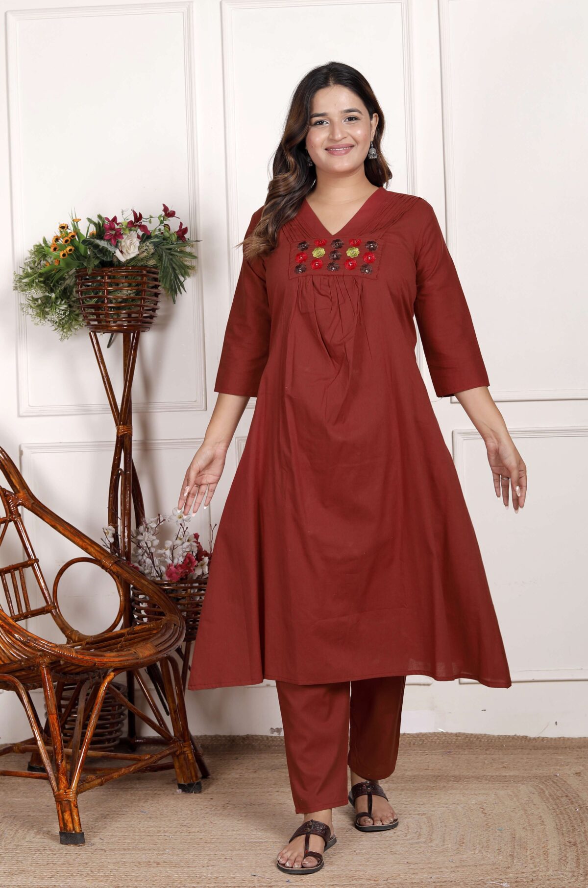 Women’s Cotton Embroidered Anarkali Kurti With Pant (Maroon)