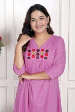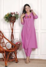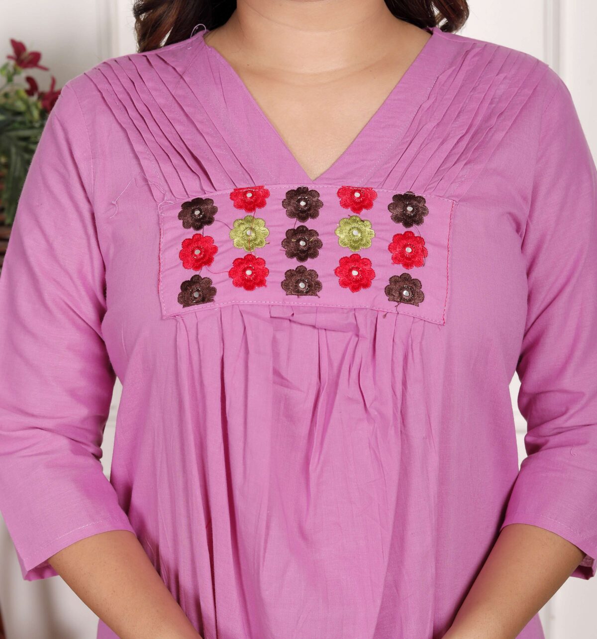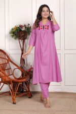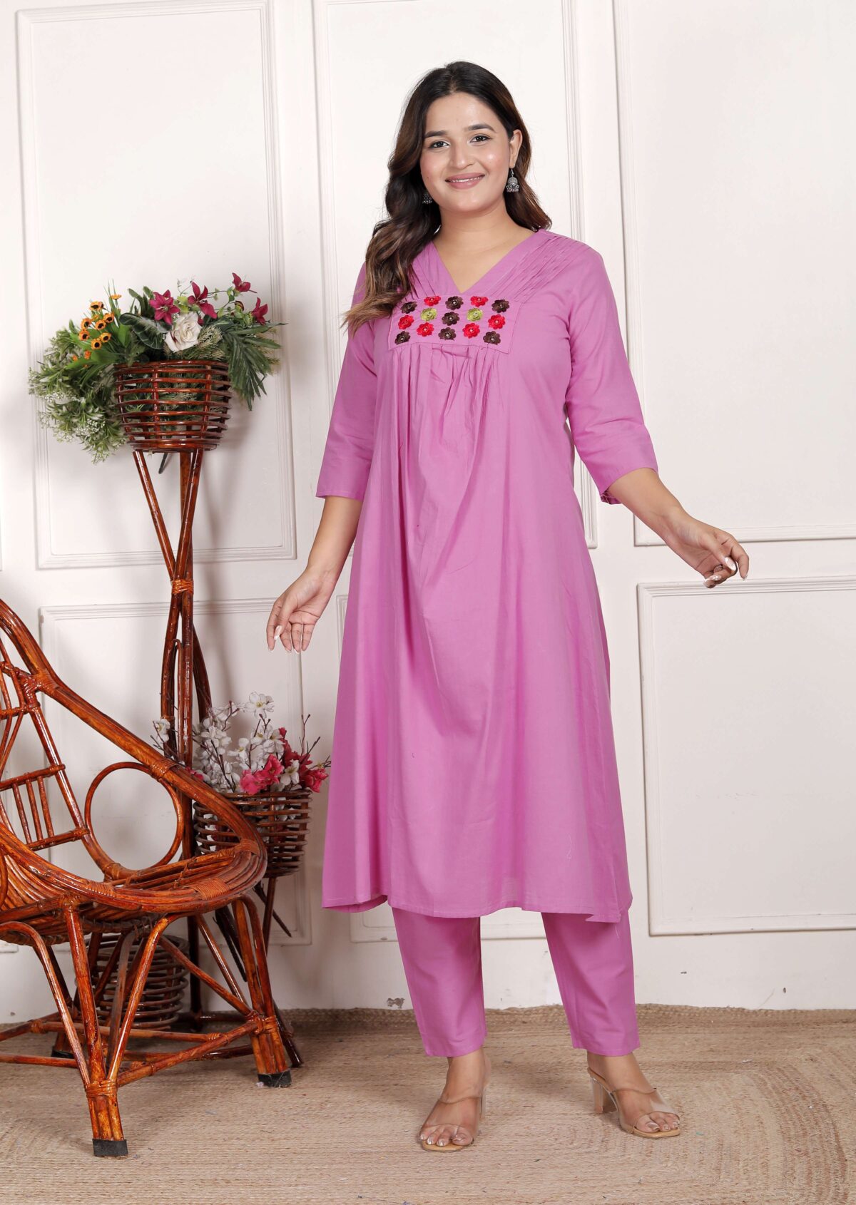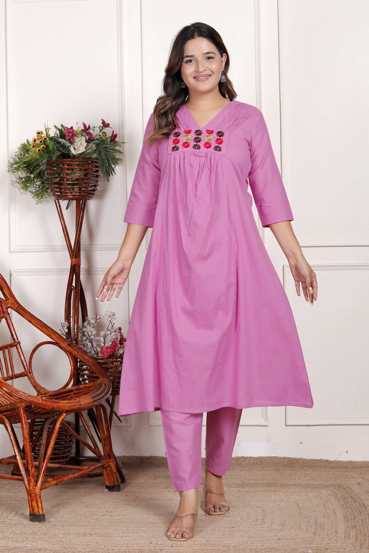 Women’s Cotton Embroidered Anarkali Kurti With Pant (PINK)