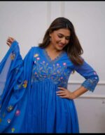 Women’s Cotton Embroidered Long Anarkali Kurti With Pant and Dupatta Set