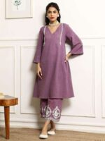 Women’s Cotton Embroidered Straight Kurta & Pant With Dupatta Set (Purple)