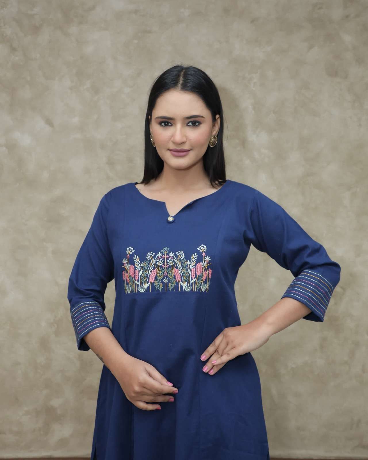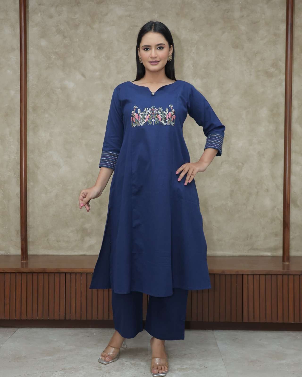 Women’s Cotton Embroidered Straight Kurti With Pant Set