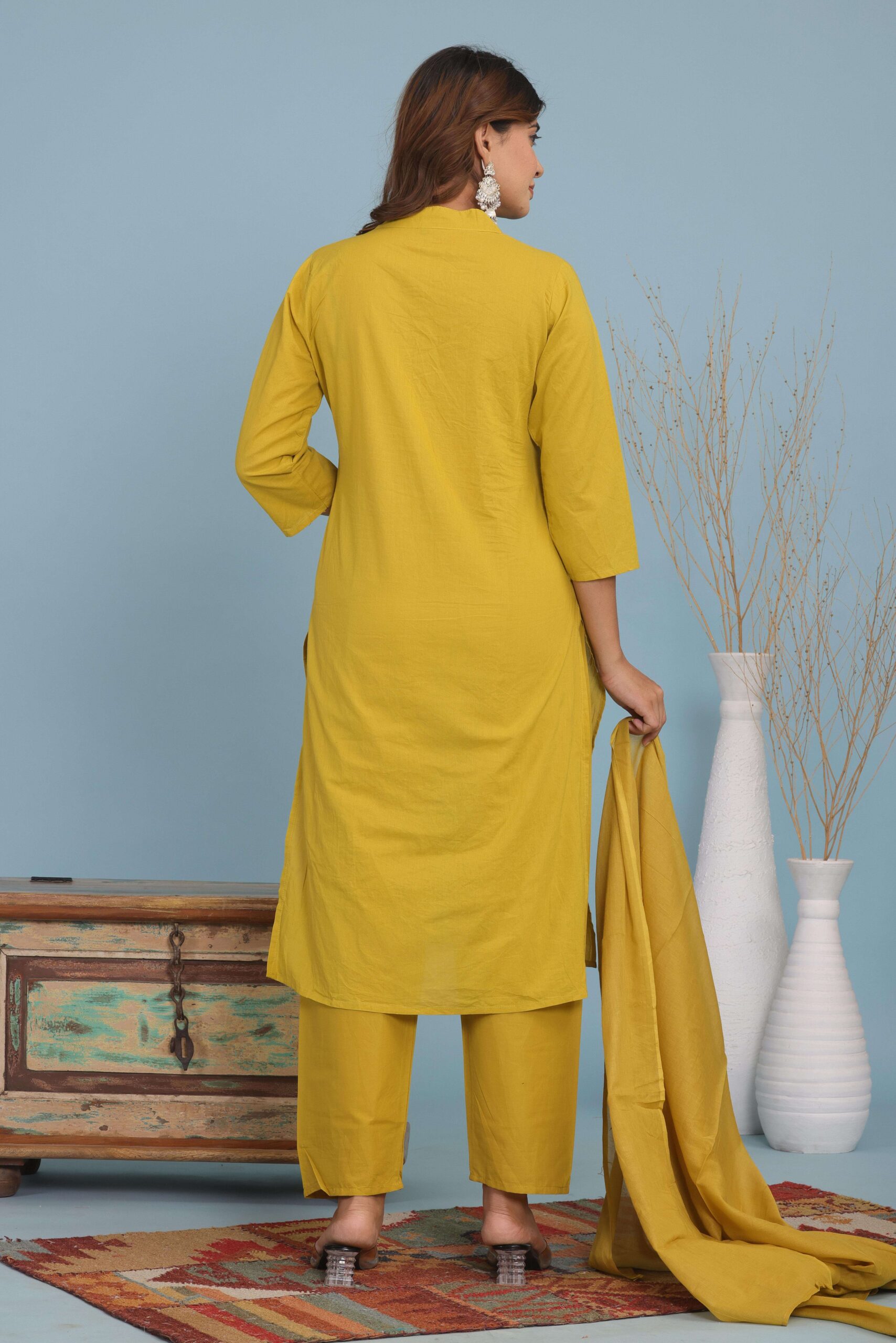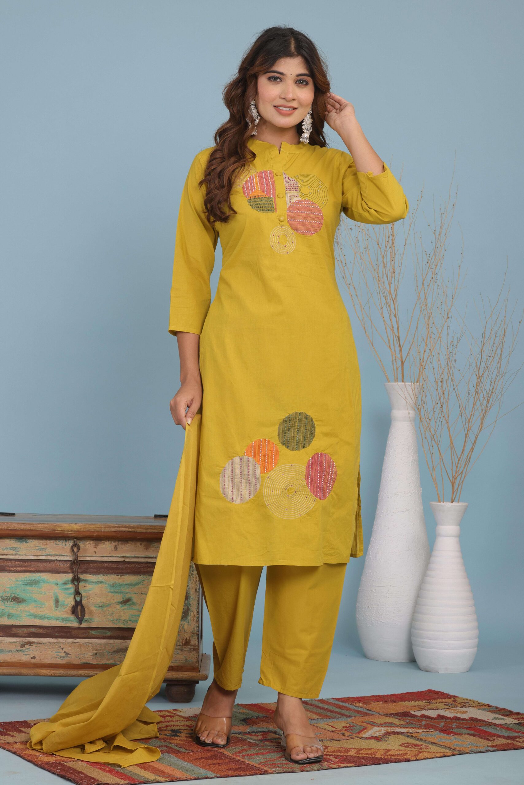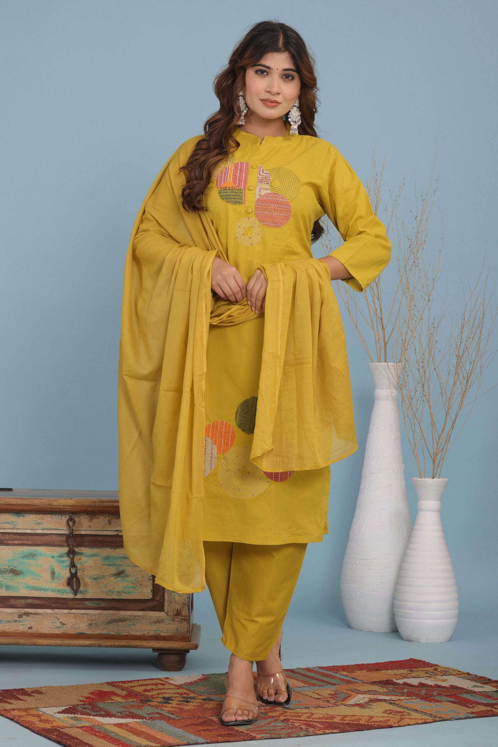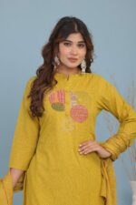 3 Piece Kurti with Pant and Dupatta Set. Designed for comfort and style, this outfit offers a perfect combination of tradition and modern fashion. The stylish kurti, paired with matching pants and a graceful dupatta, makes it an ideal choice for festive occasions, office wear, family gatherings, or casual outings. Its smart design and easy-to-wear fit ensure you look effortlessly classy all day long.