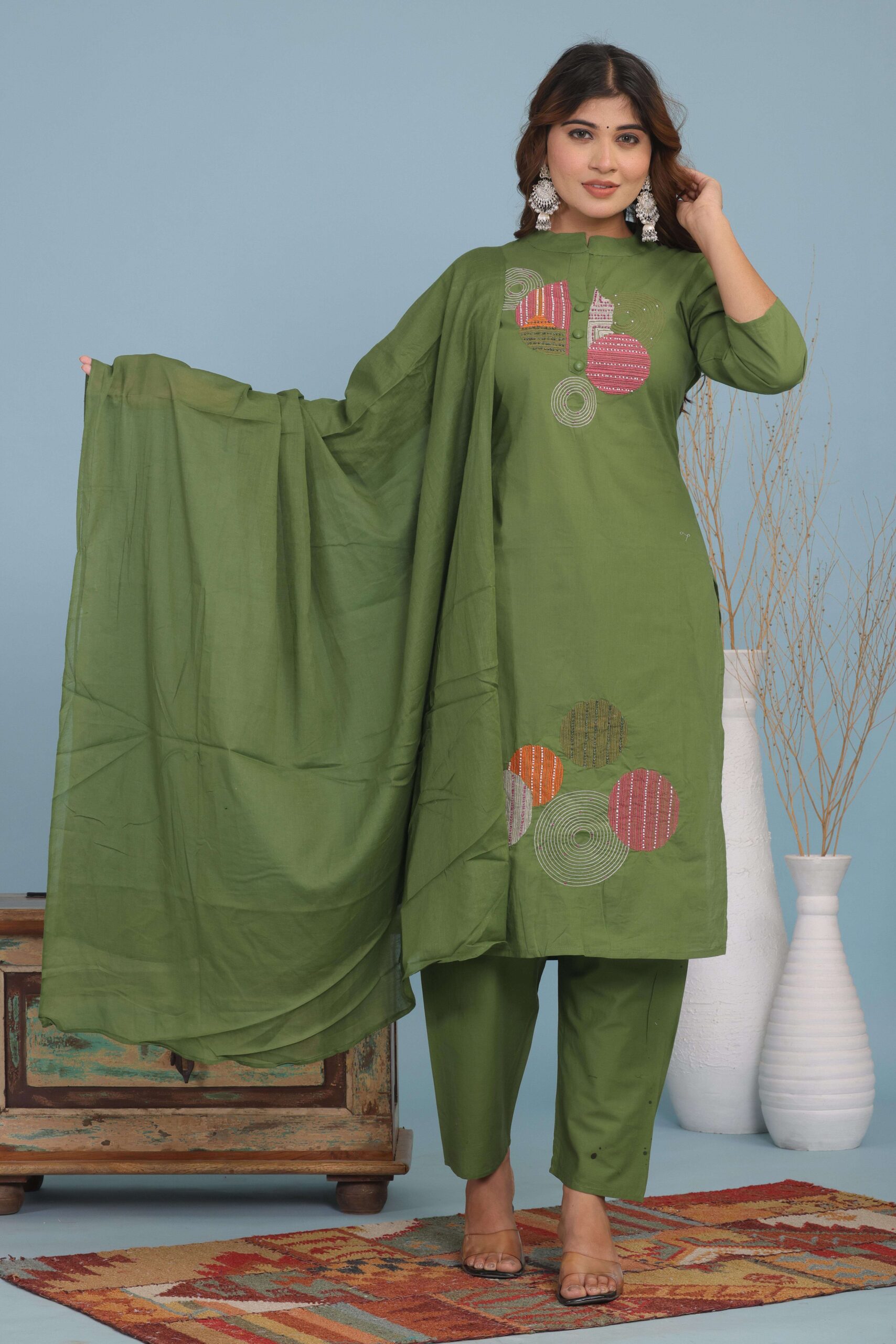 3 Piece Kurti with Pant and Dupatta Set. Designed for comfort and style, this outfit offers a perfect combination of tradition and modern fashion. The stylish kurti, paired with matching pants and a graceful dupatta, makes it an ideal choice for festive occasions, office wear, family gatherings, or casual outings. Its smart design and easy-to-wear fit ensure you look effortlessly classy all day long.