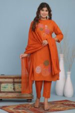 3 Piece Kurti with Pant and Dupatta Set. Designed for comfort and style, this outfit offers a perfect combination of tradition and modern fashion. The stylish kurti, paired with matching pants and a graceful dupatta, makes it an ideal choice for festive occasions, office wear, family gatherings, or casual outings. Its smart design and easy-to-wear fit ensure you look effortlessly classy all day long.