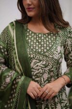 Women’s Cotton Floral Printed Anarkali Kurti With Pant and Mulmul Dupatta Set