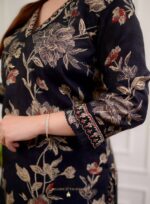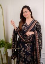 Women’s Cotton Floral Printed Straight Kurti With Afghani Style Pant and Dupatta Set (Black)