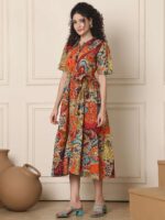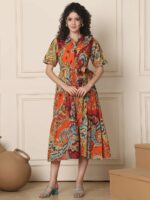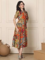 Women’s Cotton Printed A-Line Midi Dress | Short Sleeve Flared Gown Dress (Multti Color1)