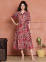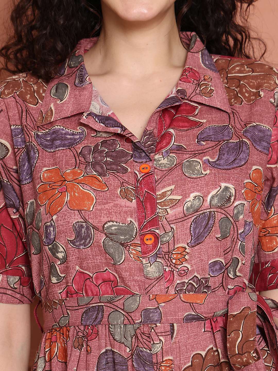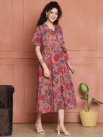 Women’s Cotton Printed A-Line Midi Dress | Short Sleeve Flared Gown Dress (Pink)