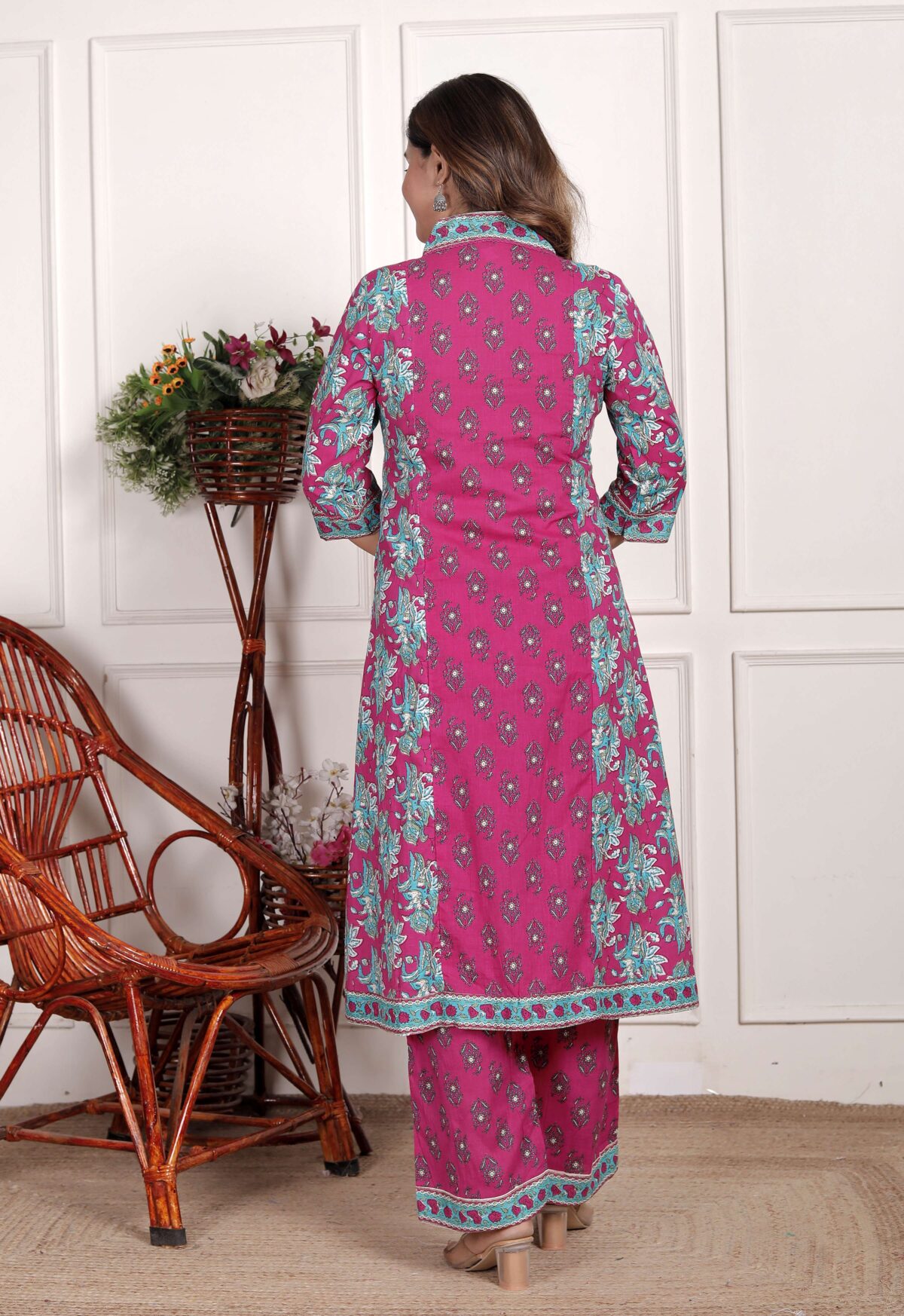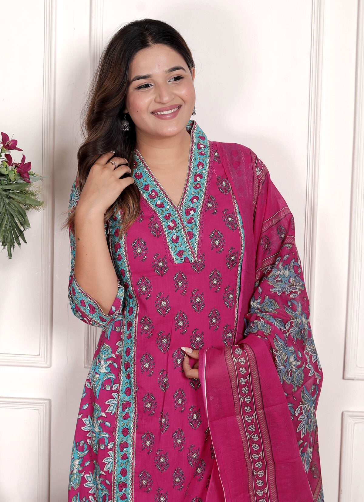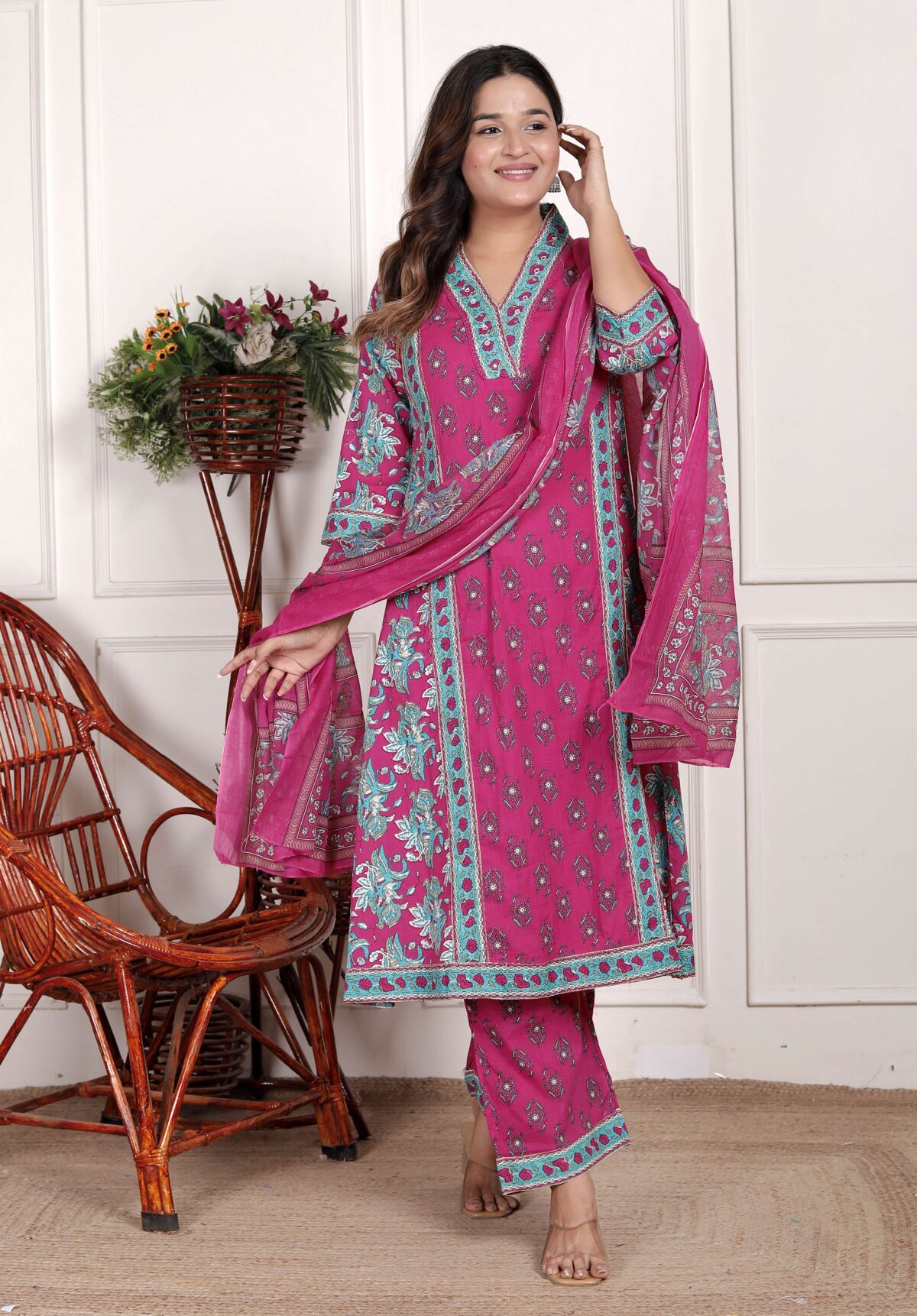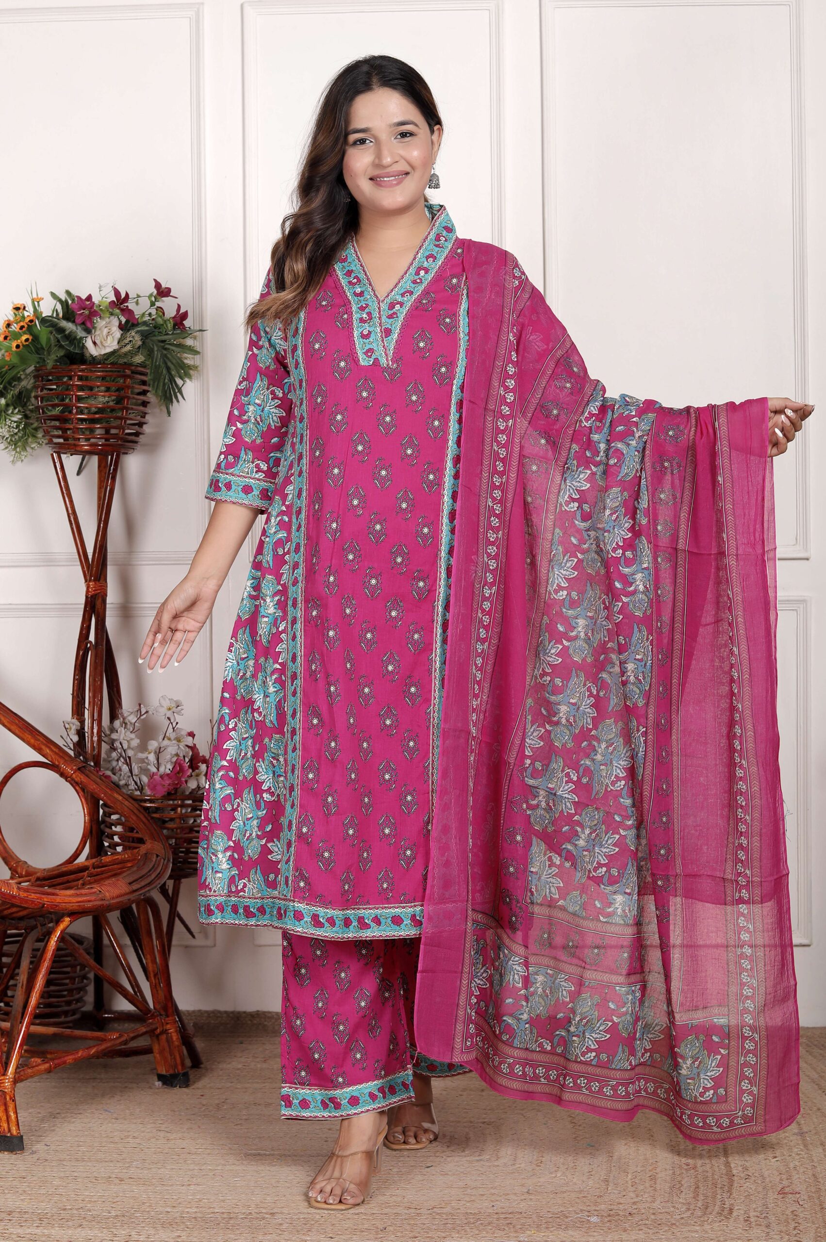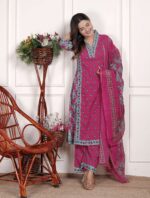 Women’s Cotton Printed Straight Kurti With Pant and Dupatta Set (PINK)