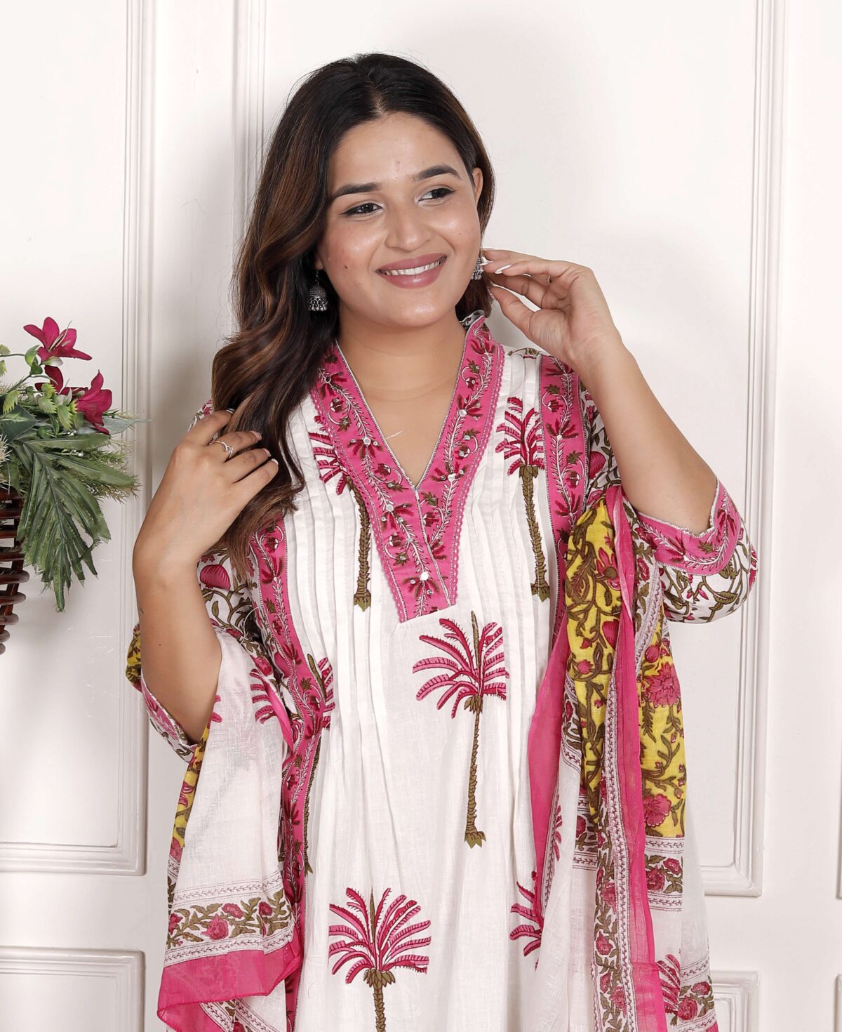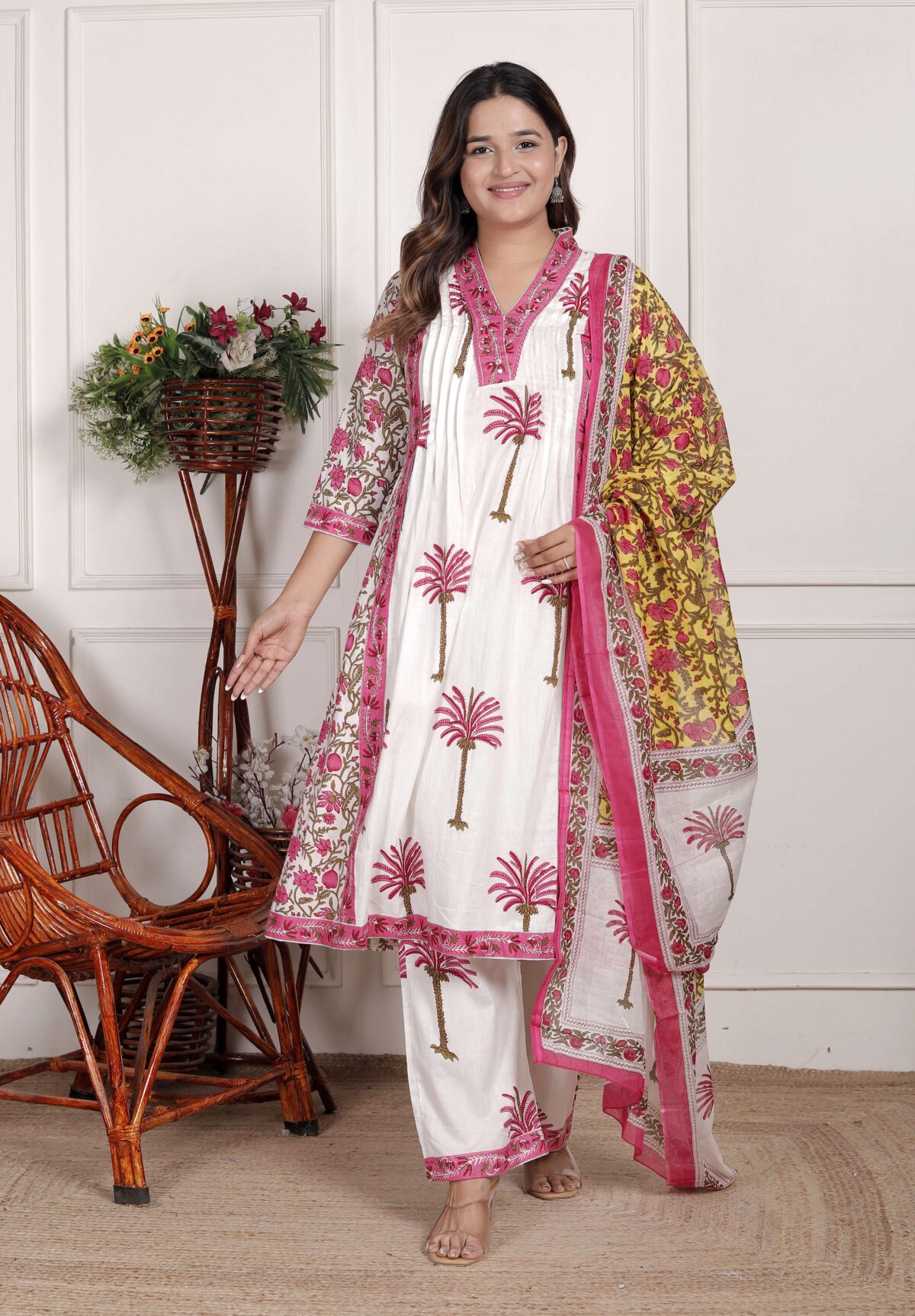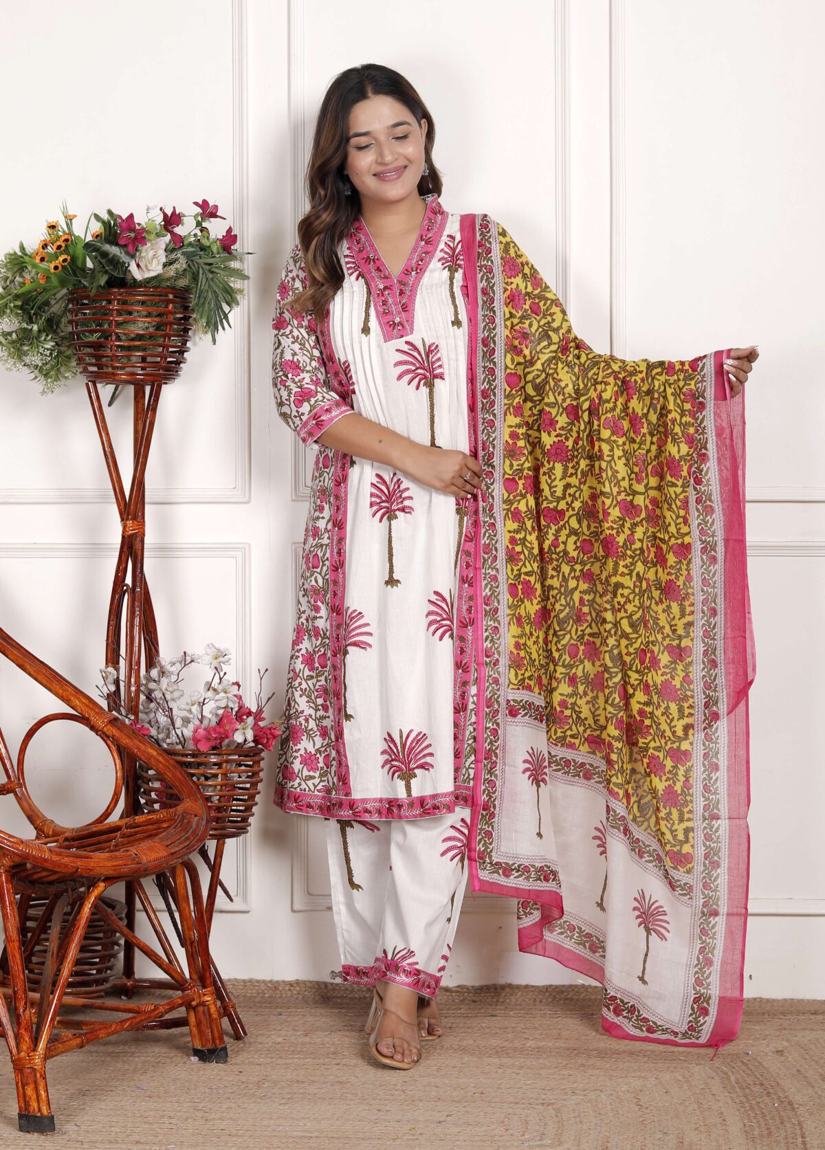 Women’s Cotton Printed Straight Kurti With Pant and Dupatta Set (White Pink)
