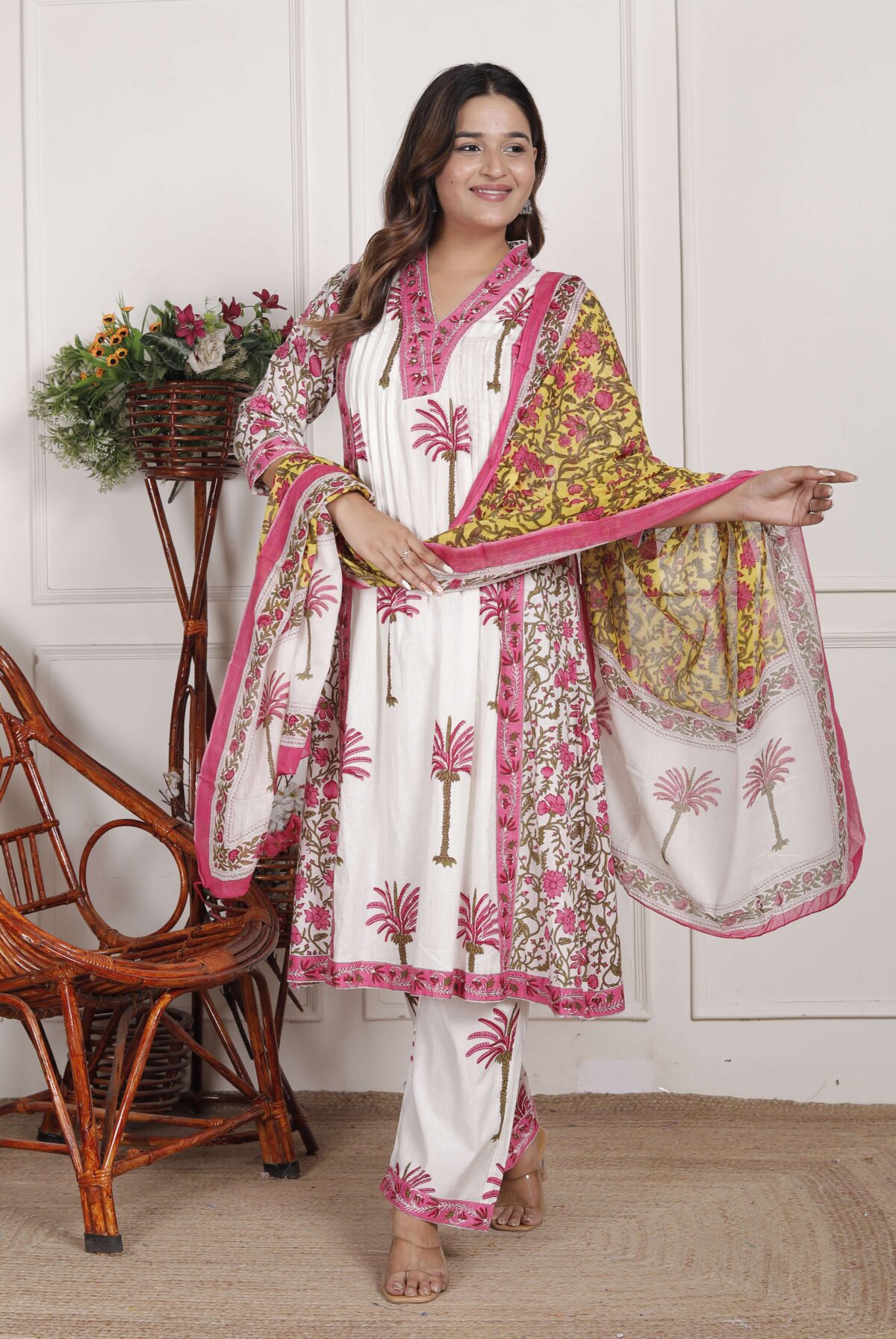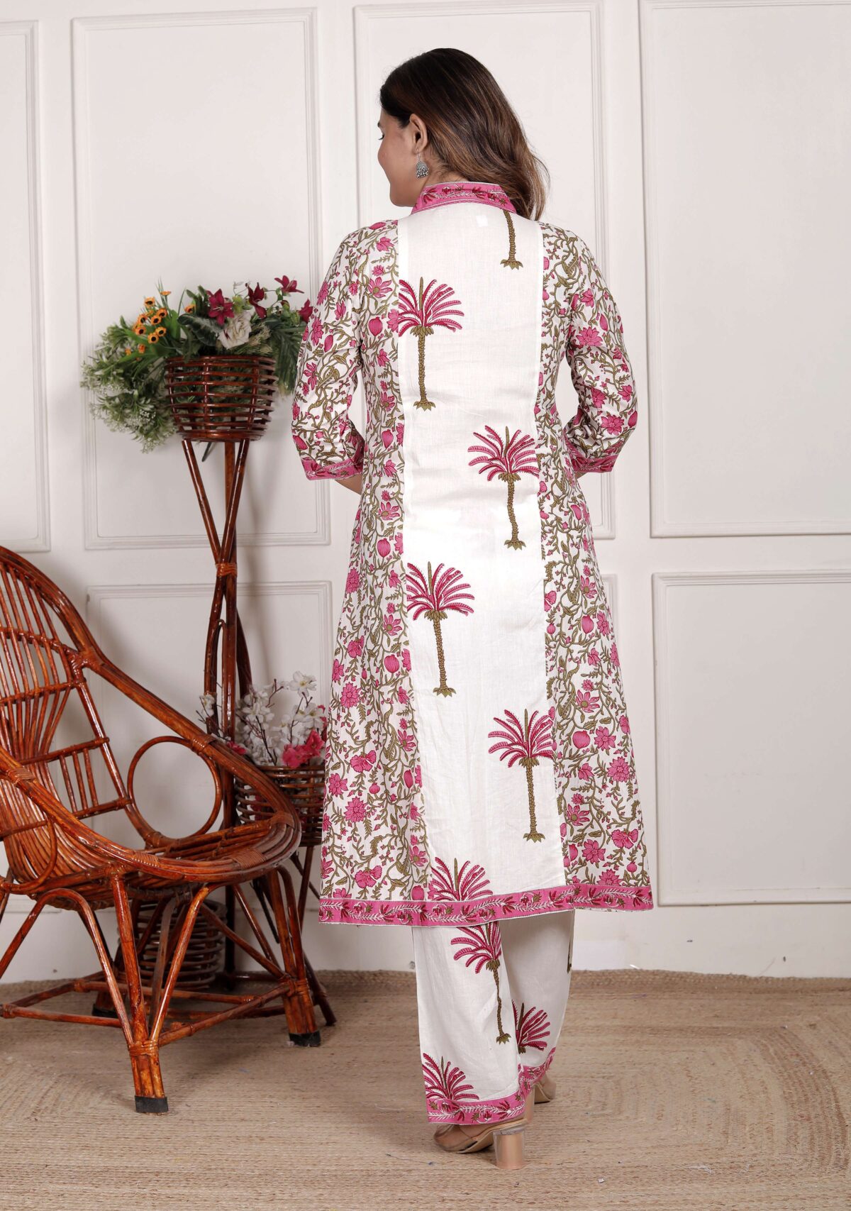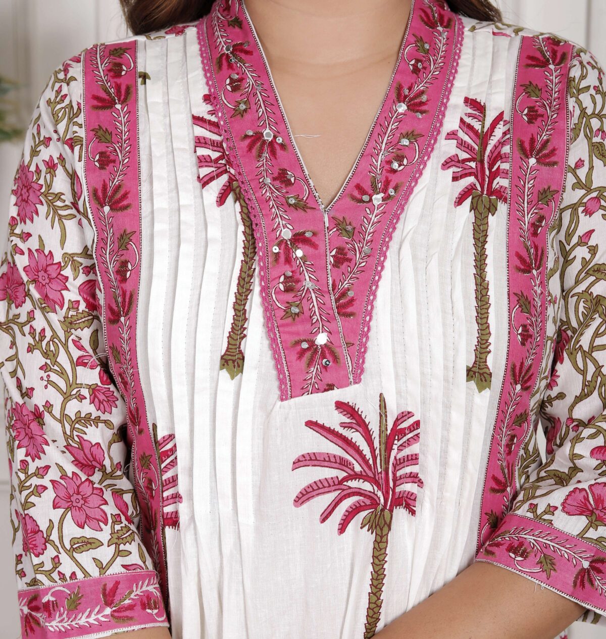 Women’s Cotton Printed Straight Kurti With Pant and Dupatta Set (White Pink)