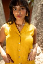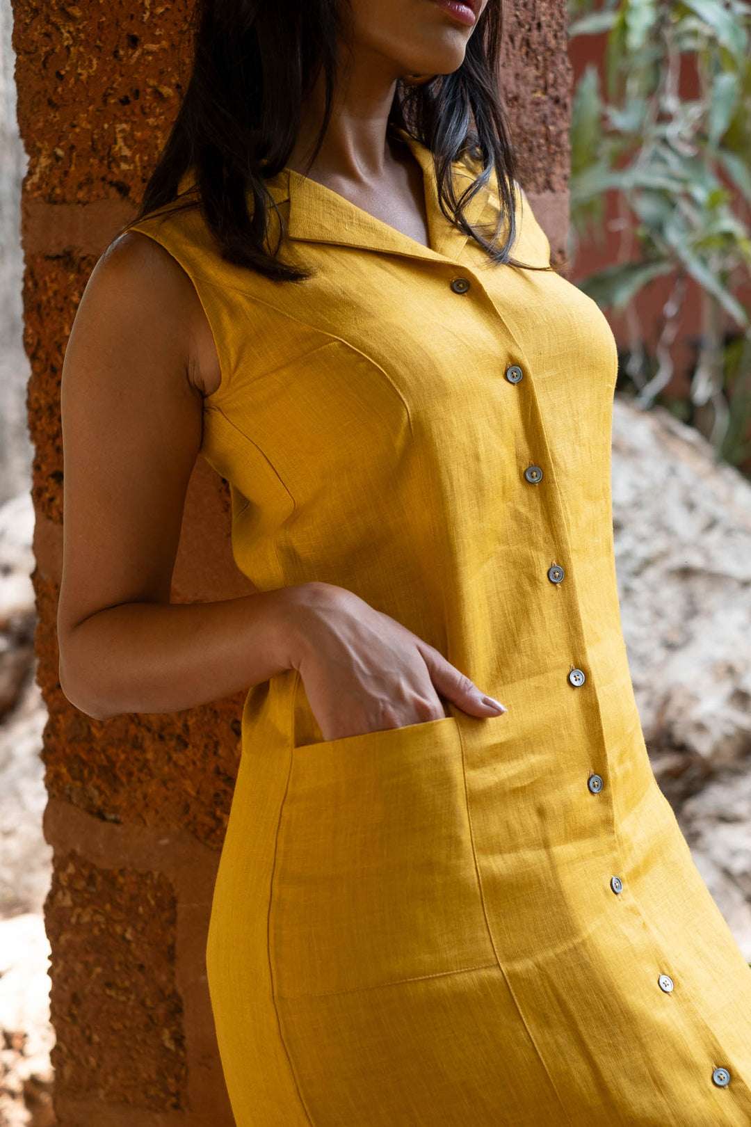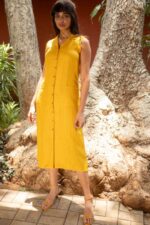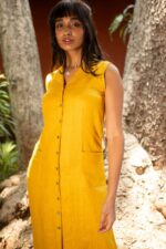 Women’s Cotton Solid Oversized Fit Spread Collar Sleeveless Dresses ( Golden )